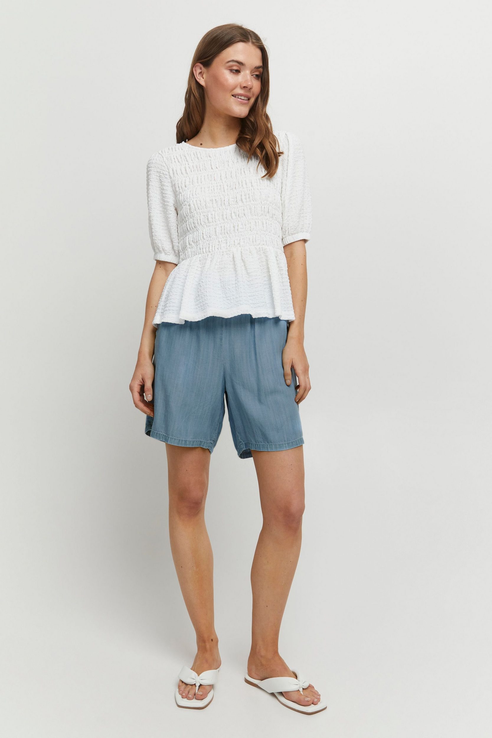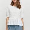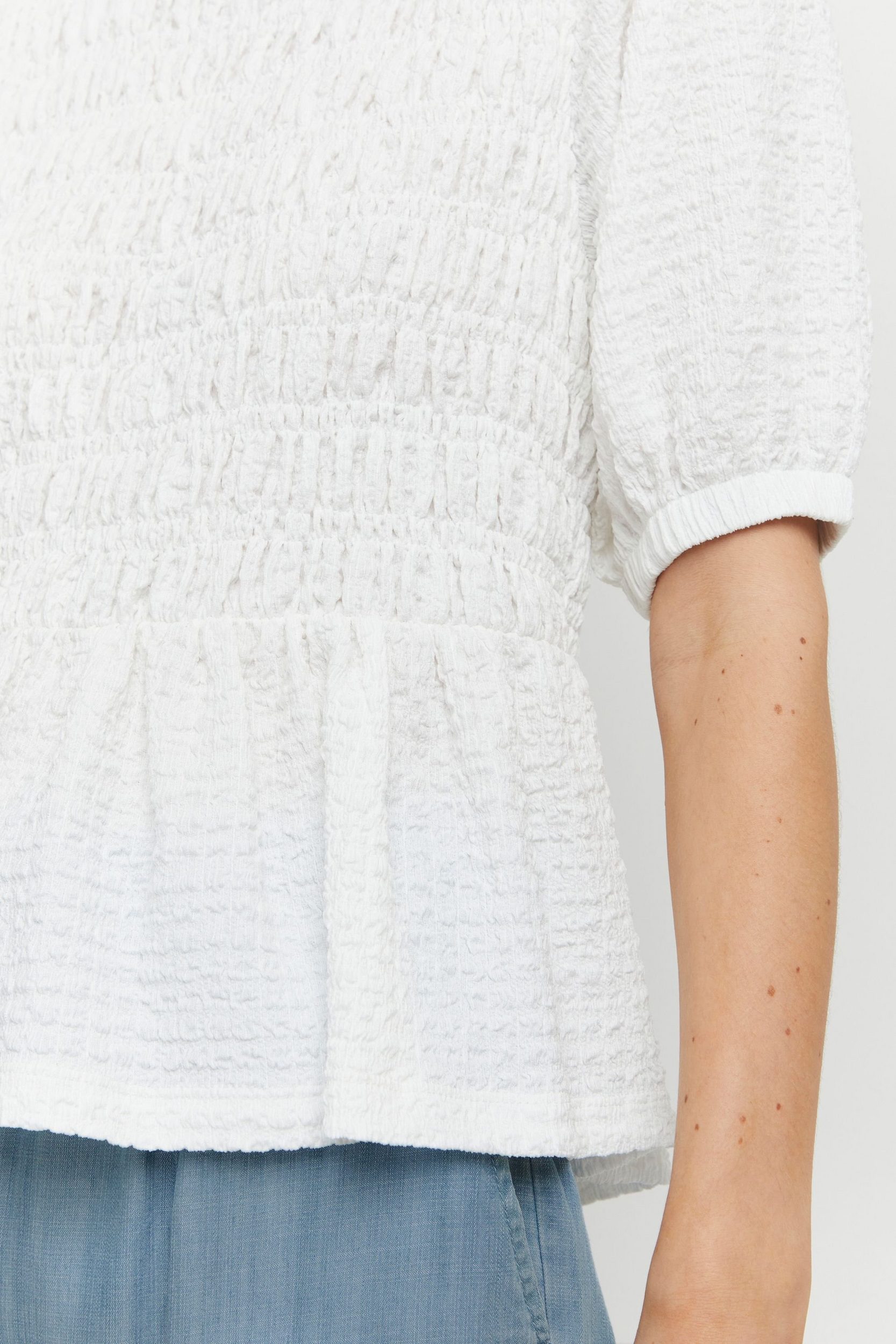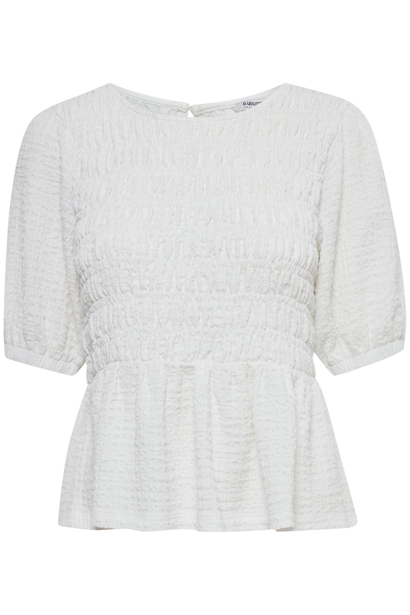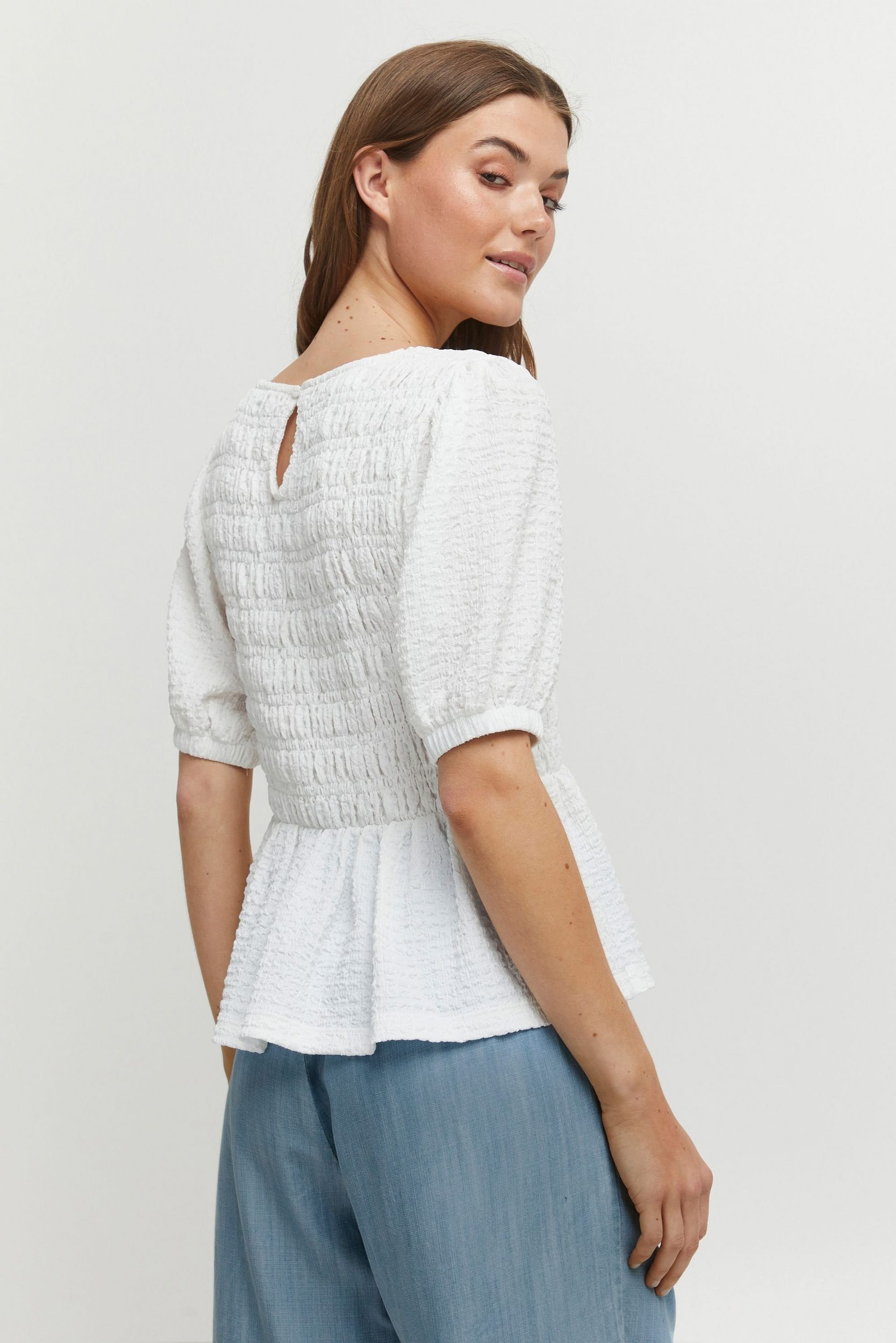 Blouse with a round neckline, fabric with a special structure, half sleeves, sleeve hem with elastic band, keyhole cutout on the back, attached peplum, fitted with a dividing seam at waist height, tone-on-tone seams, rounded hem, pleasantly soft quality with stretch, plain colour