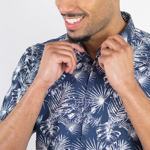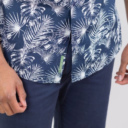 Wear open over a white t-shirt with shorts for the daytime or buttoned up with chinos for a relaxed evening look. 100% Cotton, Short sleeves, Bespoke print, Curved hem.