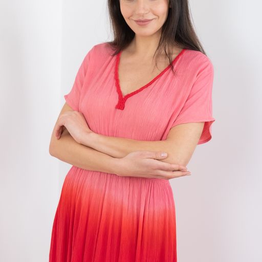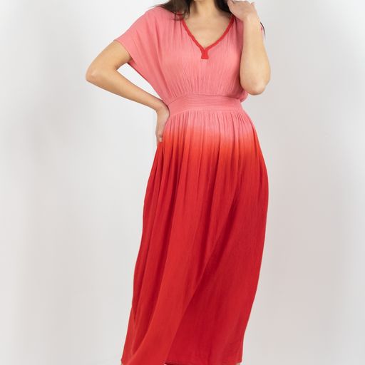 Clare Dip Dye Dress is the perfect addition to your summer wardrobe. Crafted from a crinkled crepe fabric, this maxi-length dress features a v-neck with a plaited rope edge and a shirred elasticated waist for a flattering fit. The bottom half of the dress is finished with a dip dye effect for a unique look.