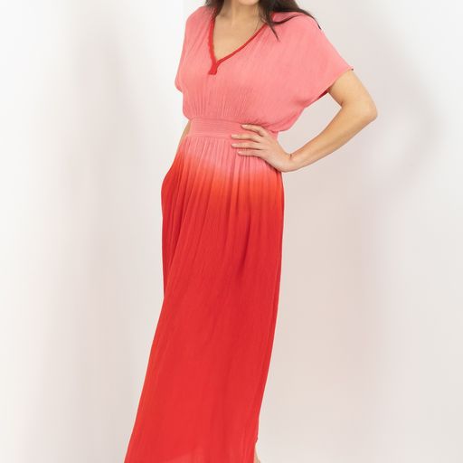 This Clare Dip Dye Crepe Dress in Pink is sure to become a favourite in your wardrobe. With its maxi length, v-neck, elasticated waist and capped sleeve, it’s the perfect dress for any occasion.