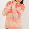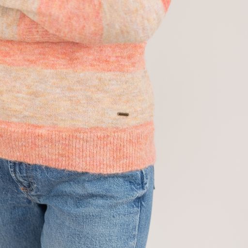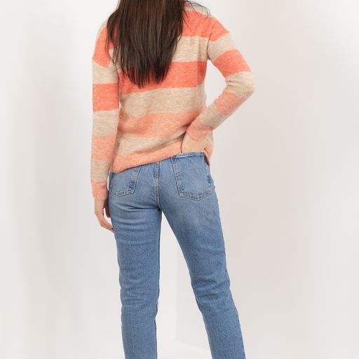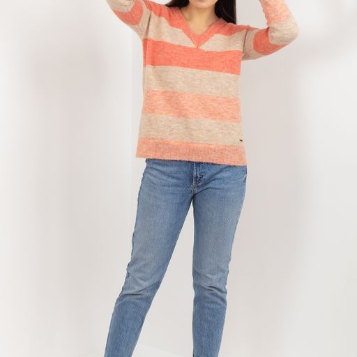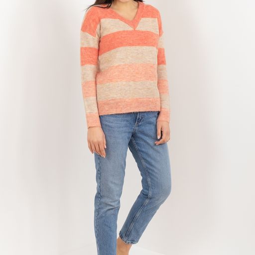 Darcey Ombre Stripe Knit. This super soft Darcey stripe knit has a chunky rib v-neck, rib hem and cuff details. Its made from a blend of fibres including 74% is recycled polyester. This jumper also features our signature Buckley metal tab on the left hem. Pair with slim jeans, over a t-shirt for a relaxed weekend look. Oversized fit. V-neck. Rib hem and cuffs, Super soft fabric Ombre stripe.
