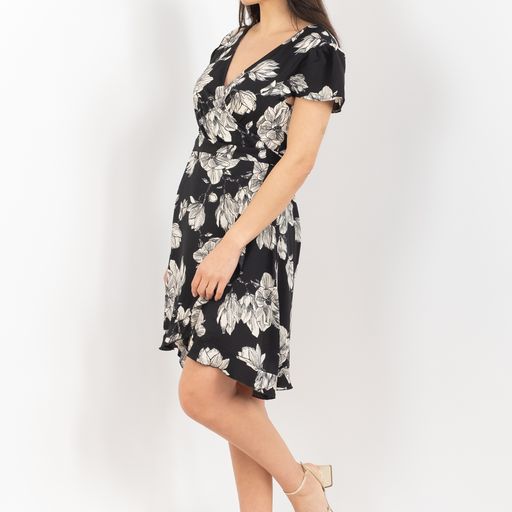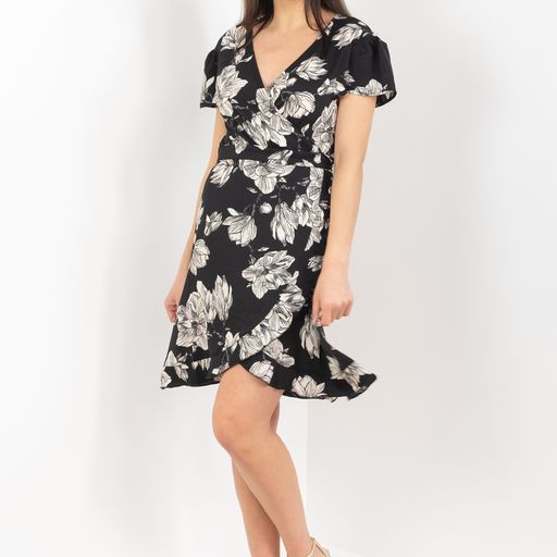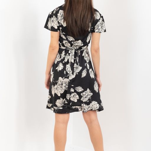 Page Wrap Dress is the perfect addition to your wardrobe. This classic monochrome print dress features a tie which wraps around the body and ties at the side. Short flutter sleeves and a ruffle along the wrap hem make it super feminine and easy to dress up or down.