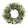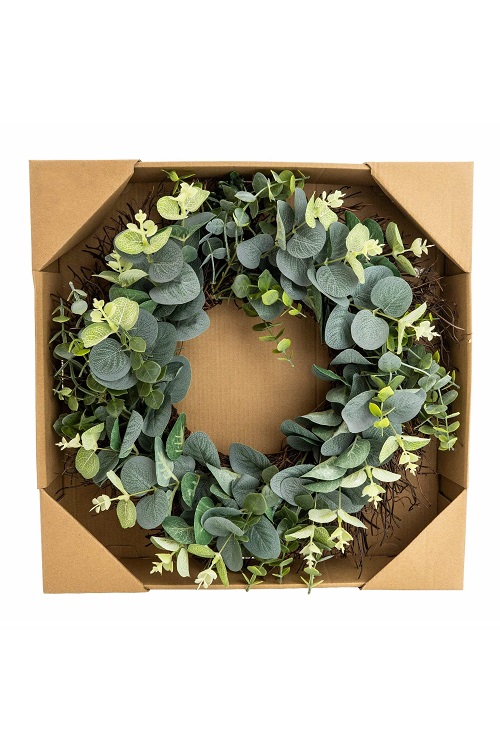 Our artificial eucalyptus & foliage wreath is made up of beautiful green tones to give it a natural look. It is perfect for displaying in any room. The wreath comes boxed in a craft pizza box.