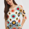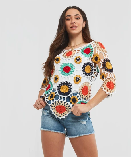 Get ready for the summer carnival season with this stunning crochet women’s sweater. In a relaxed fit, finished with a wide neck and scalloped hem, it’ll sit beautifully on any body shape. Its colourful design is one we’re all here for. Bright, bold and truly unique, it’s a remarkable style that you won’t find anywhere else.