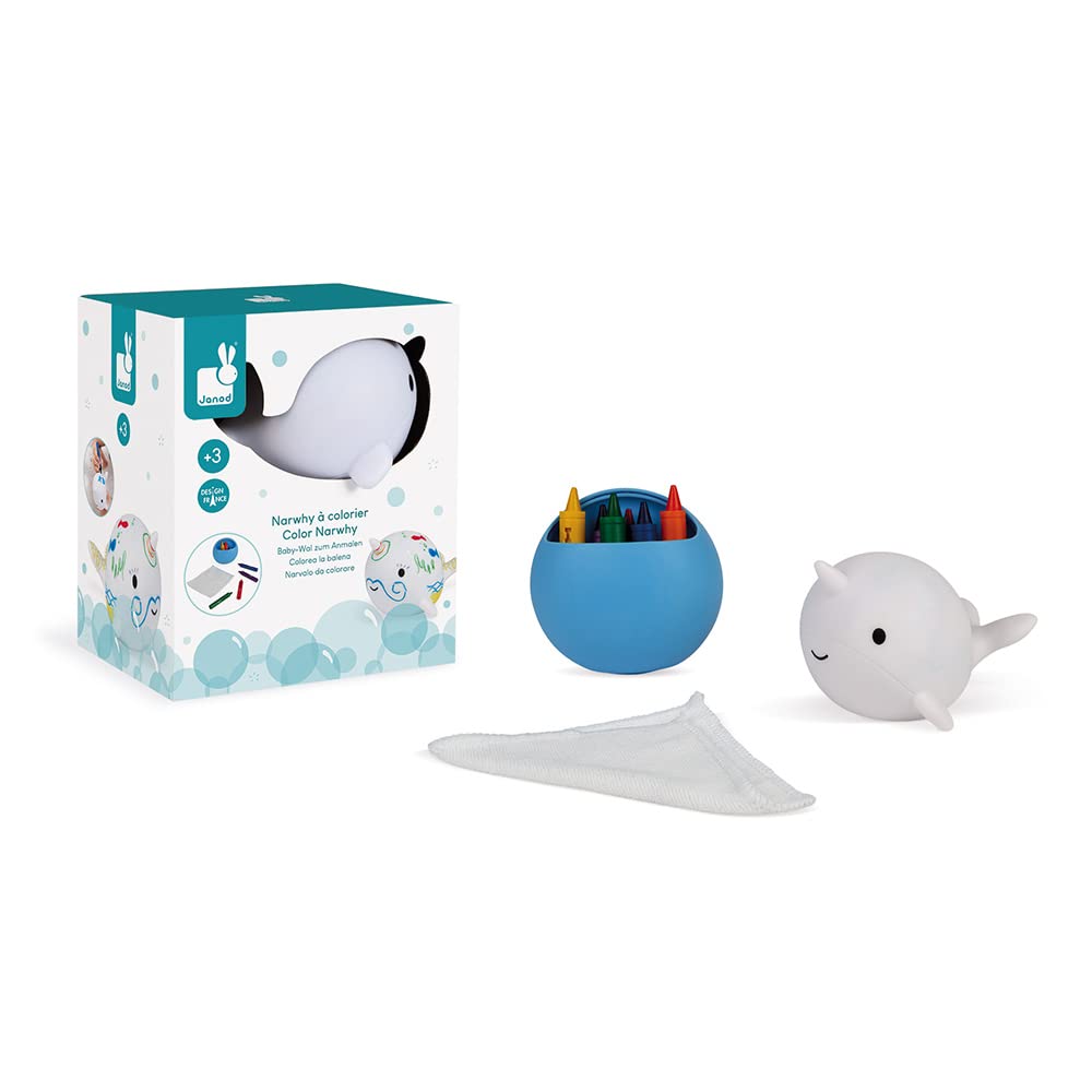 NARWHAL TO COLOUR-IN : this little cousin of the dolphin will be ideal for your child’s bathtime with its cute, round body. Baby can colour it in over and over for hours on end using the six large, easy-to-handle coloured pencils and small cloth included in the set