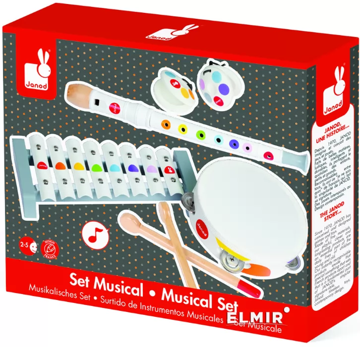 The tools of the perfect little musician! This wooden music set includes 4 toy musical instruments for children aged 2 years and over. It allows children to try out different instruments and find their favourite or to create their own music group with their brothers, sisters and friends. Your children will have fun blowing the flute, shaking the cymbal tambourine, tapping the xylophone or shaking the castanets in their hands! Discovering different sounds, awakening their senses and learning about musical improvisation, your young children will not be able to do without these beautiful toys. Confetti is a complete range of musical toys full of colour and joy with Pop N’ Rock motifs!