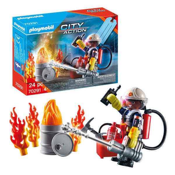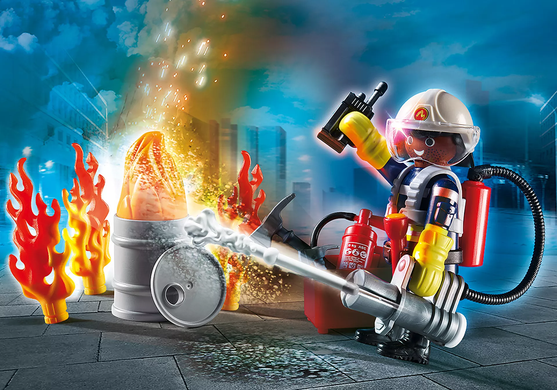 Contains:1 x Playmobil figure, 1 x Hose, 1 x Fire extinguisher, 2 x projectiles 2 x Axe, 3 x Fire, 1 x Fire barrel, 1 x Walkie talkie 1 x Box, 1 x Lid