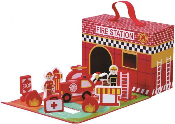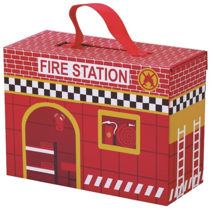 The firestation is made of heady duty cardboard and folds up into a storage box to hold the wooden accessories.