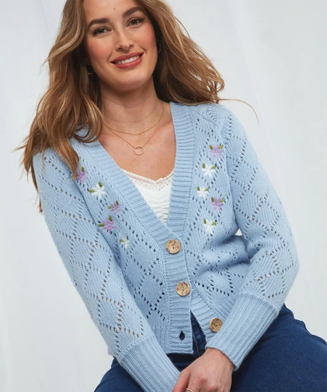 Our stunning cosy ladies cardigan is one you definitely won’t forget. You’ll love how the chunky pointelle knit works so effortlessly with its delicate floral embroidery, creating a gorgeous feminine shape that’ll really flatter any figure. Finished with deep cuffs and a button-through design, it’s the perfect cardigan to throw on in those sudden springtime chills.