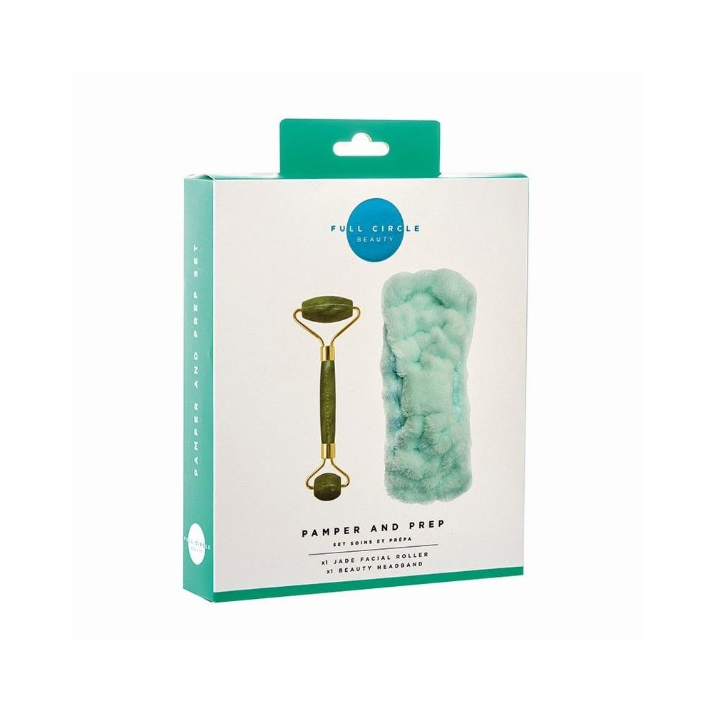 Revitalize, invigorate and relieve your skin with the Full Circle Beauty pamper and prep set with jade shaded facial roller and headband.