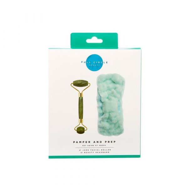 Revitalize, invigorate and relieve your skin with the Full Circle Beauty pamper and prep set with jade shaded facial roller and headband.