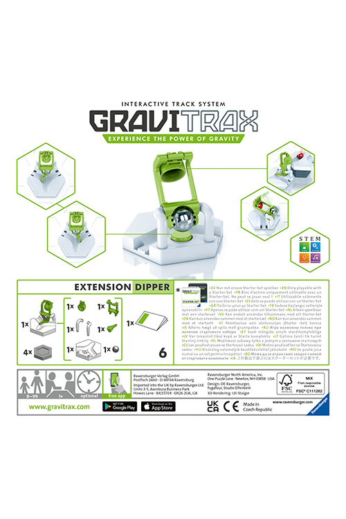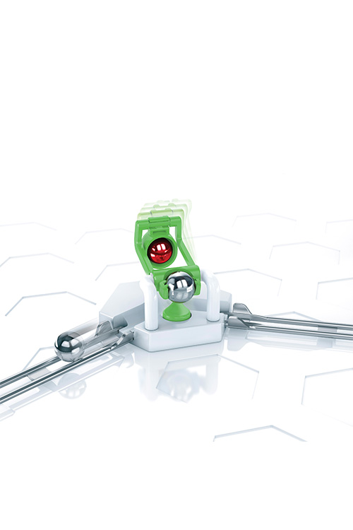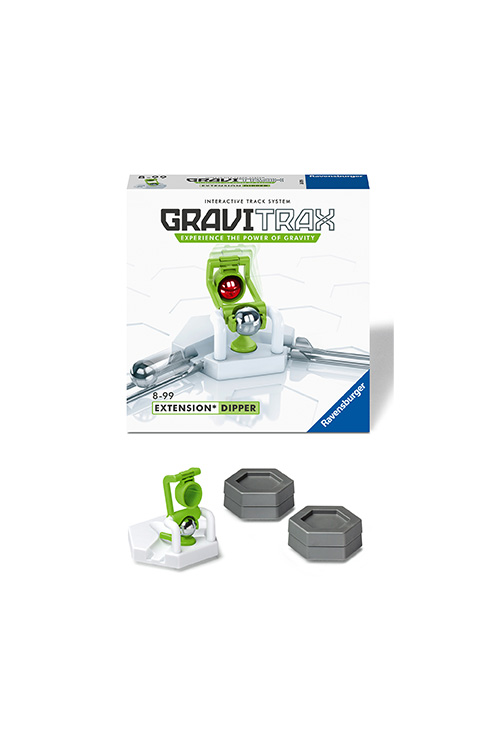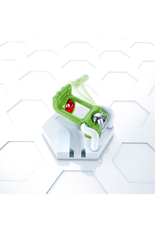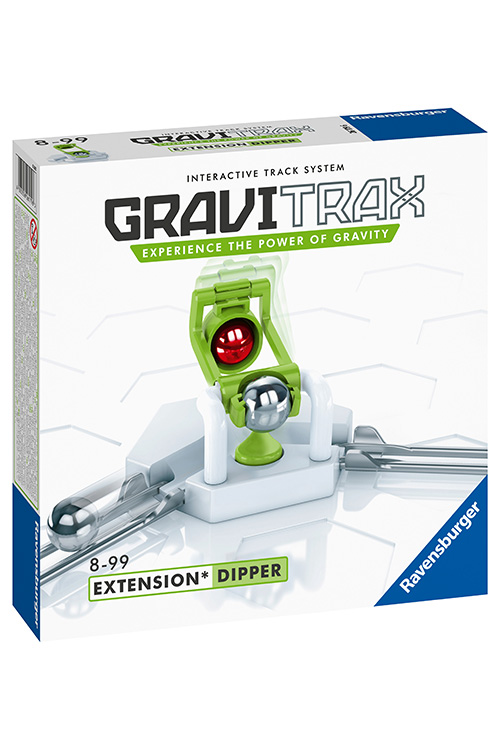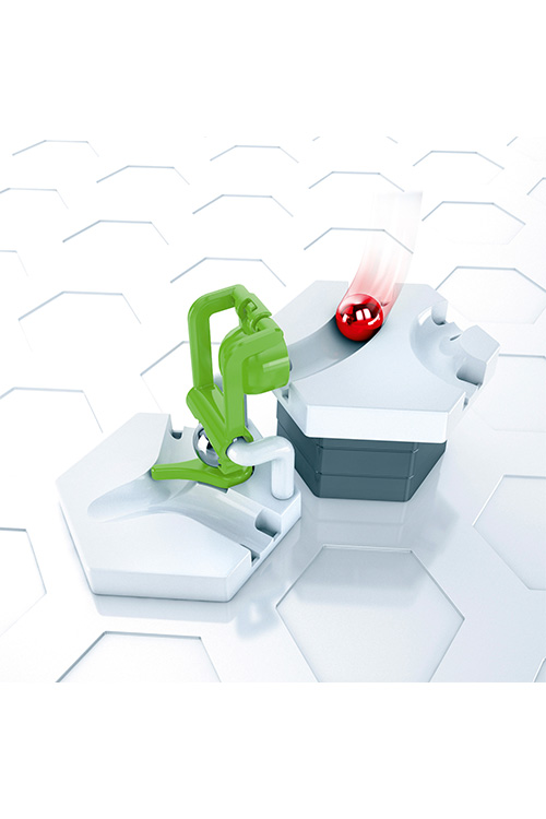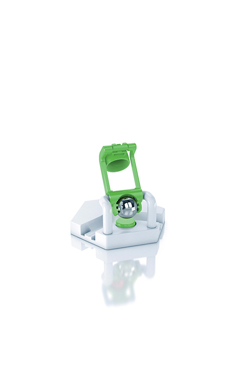 Dip down between levels! The Dipper will take your marble, pick it up, move down a level and drop it. Use this extension for a dynamic way to change between the levels in your tracks. You can control what side the ball will leave the Dipper allowing you to continue building in the right direction. Combined with the GraviTrax Starter Set, the Dipper will guarantee fast-paced fun and action-packed tracks!