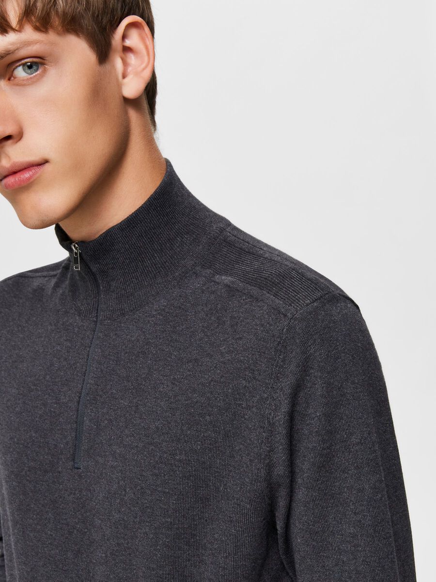 – Half zip knit – Made of soft pima cotton – Ribbed hem, collar and cuffs – The model is 186 cm and wears a size L