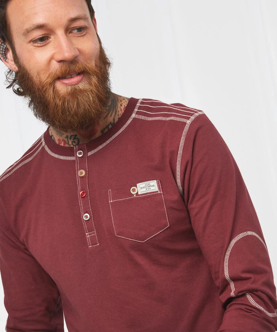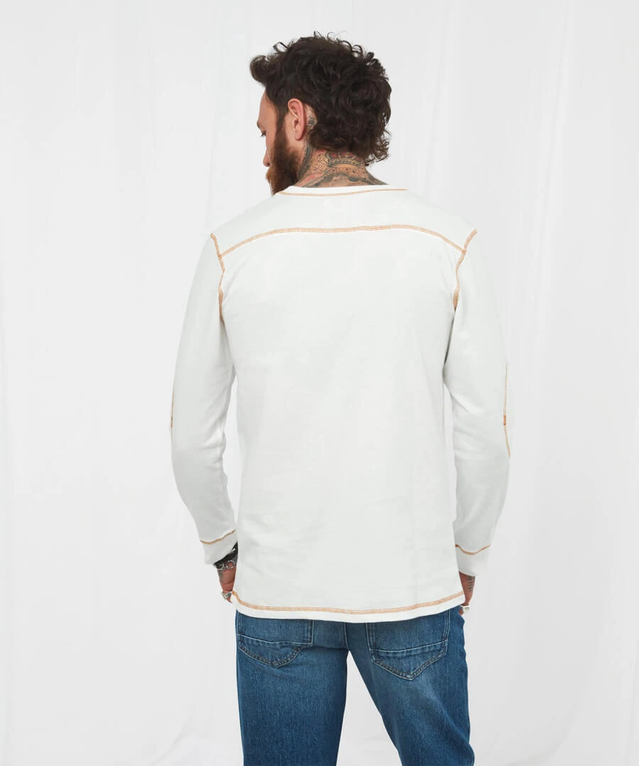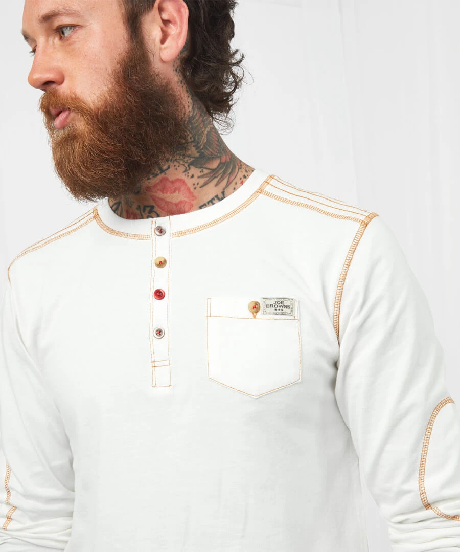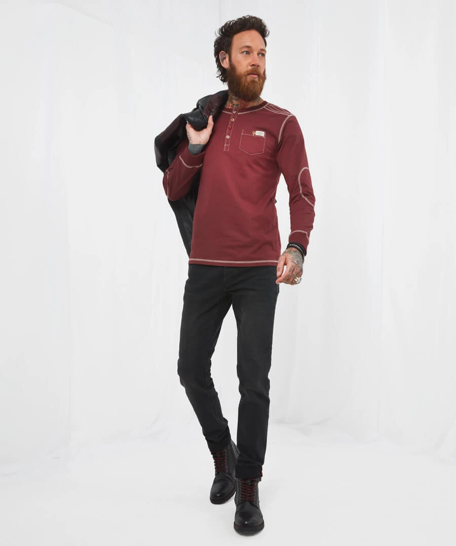 This stylish long sleeve Henley top is inspired by the design of biker leathers. The level of detail in this Henley top shows our dedication to creating staple clothing styles with a difference. Elbow patches, contrast stitching and mixed buttons combine to create something simple yet remarkable.