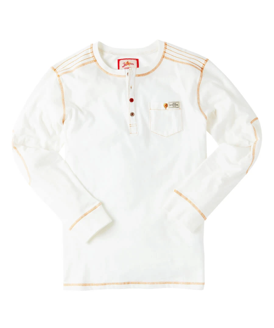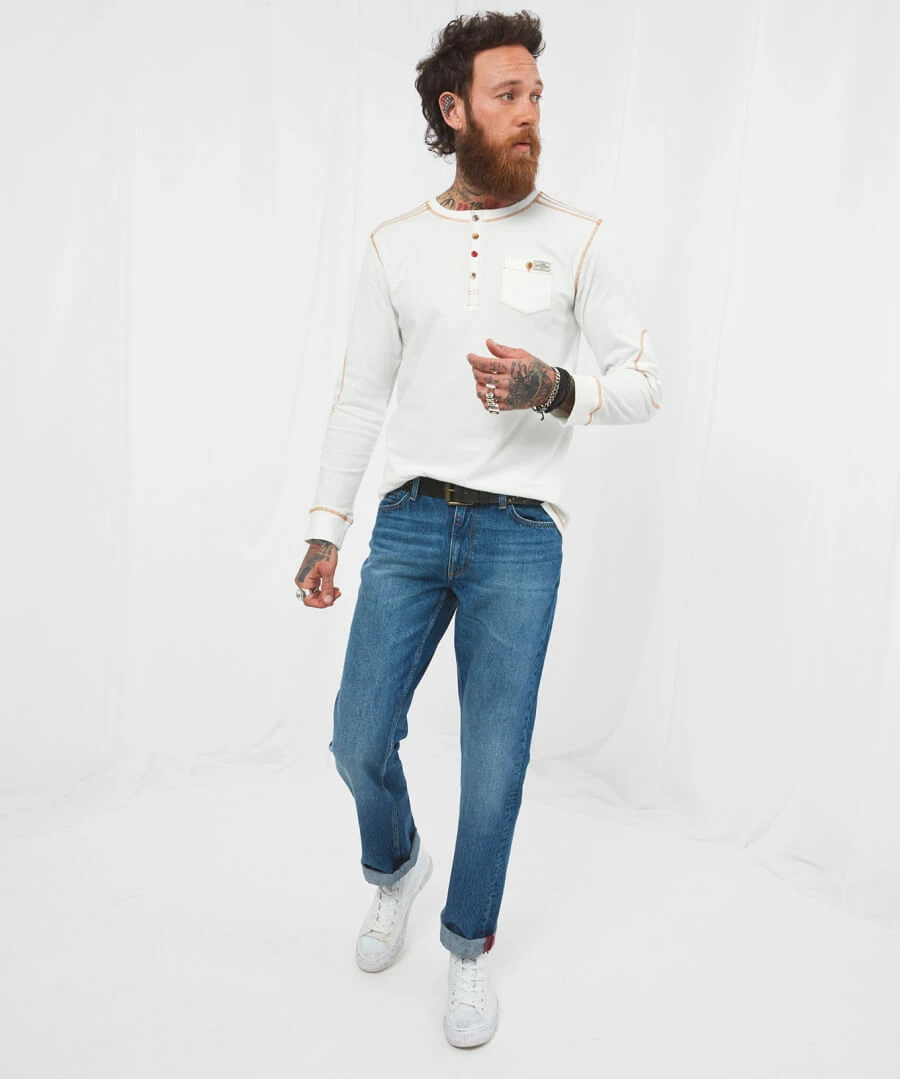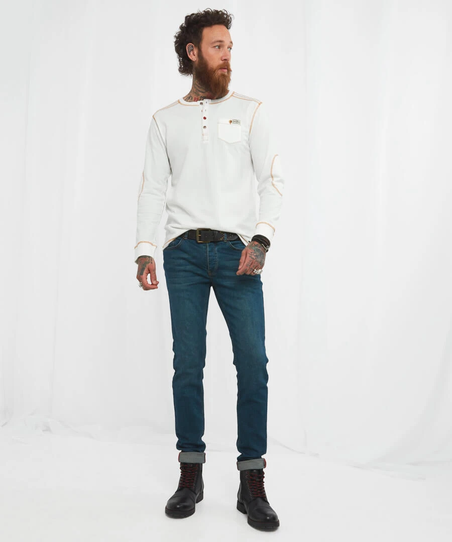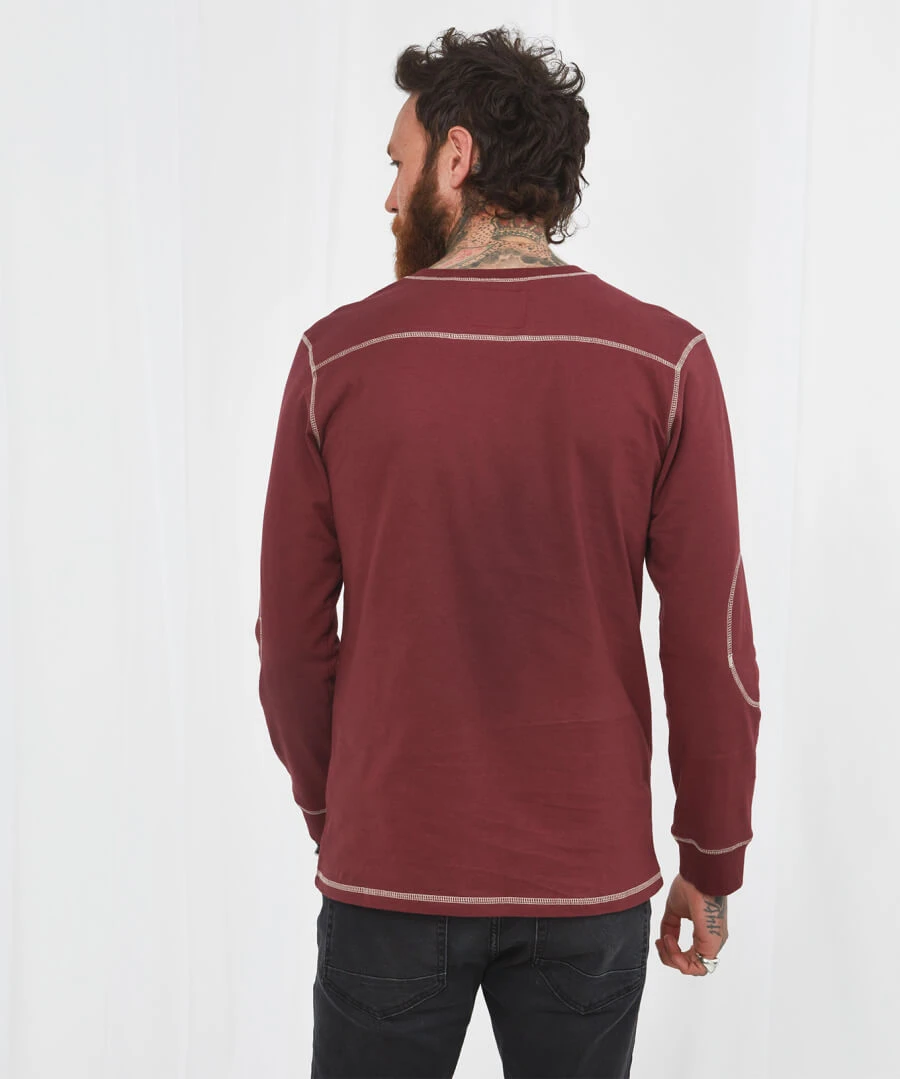 This stylish long sleeve Henley top is inspired by the design of biker leathers. The level of detail in this Henley top shows our dedication to creating staple clothing styles with a difference. Elbow patches, contrast stitching and mixed buttons combine to create something simple yet remarkable.