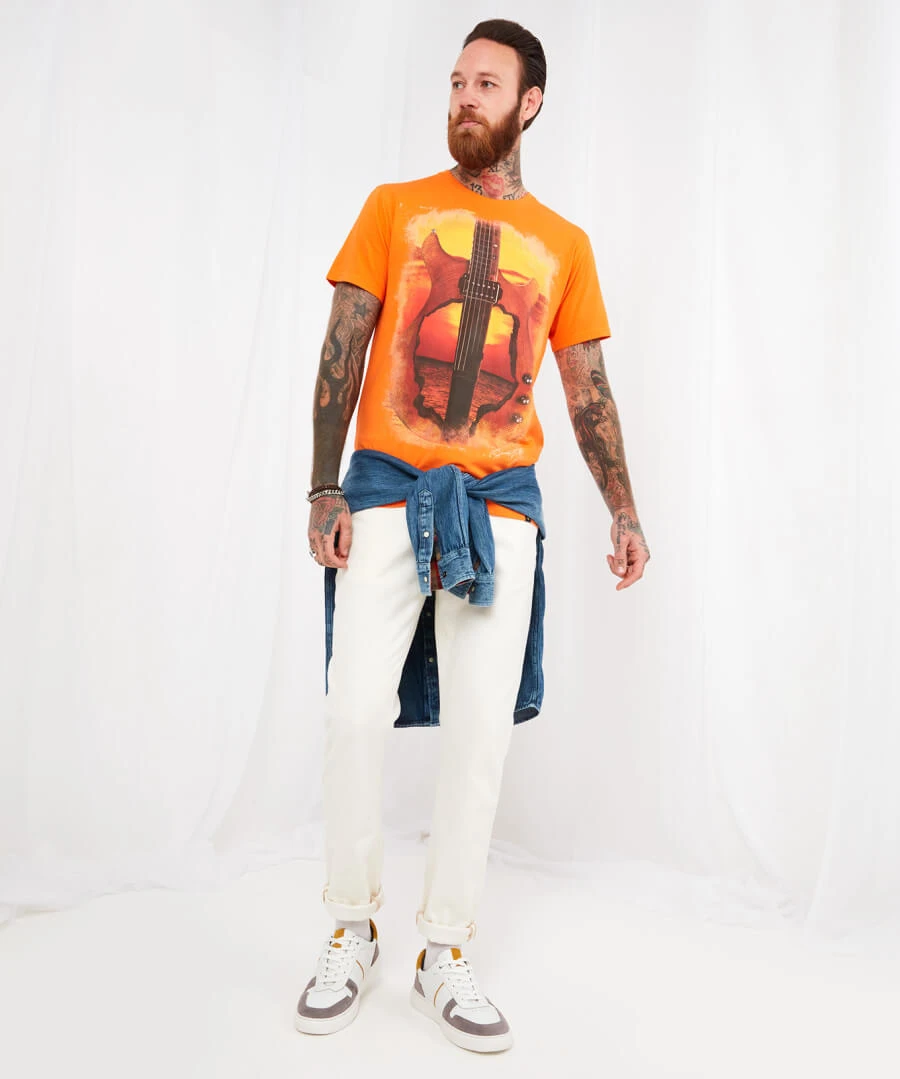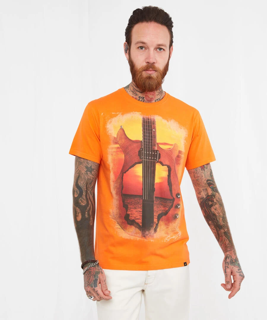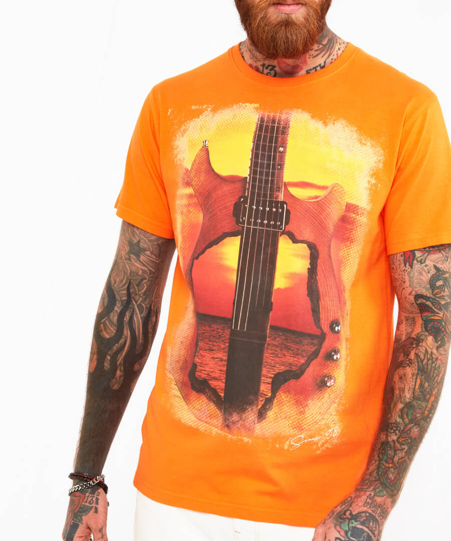 This short-sleeved t-shirt is perfect for music lovers and great to wear for a campfire singalong. In the fiery colours of a seasonal sunset, it’s just what you need to make the most of those warm summer nights. Just add jeans and watch your chill style heat up.