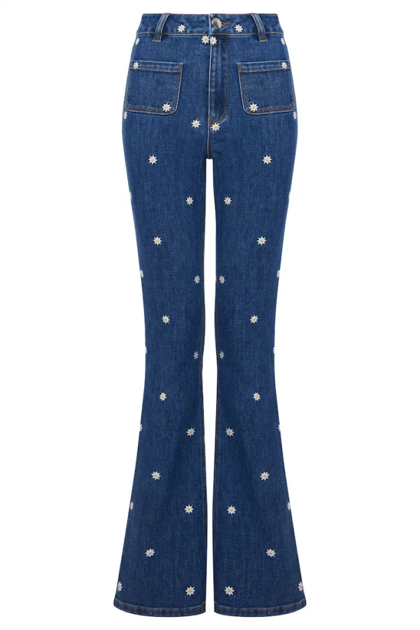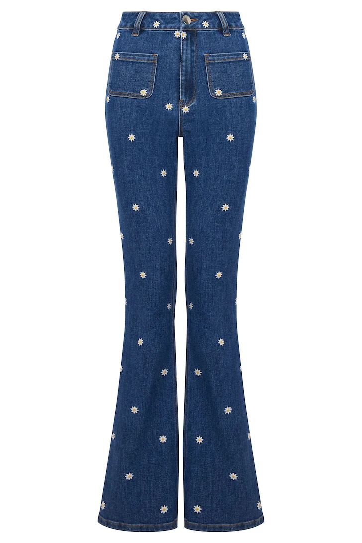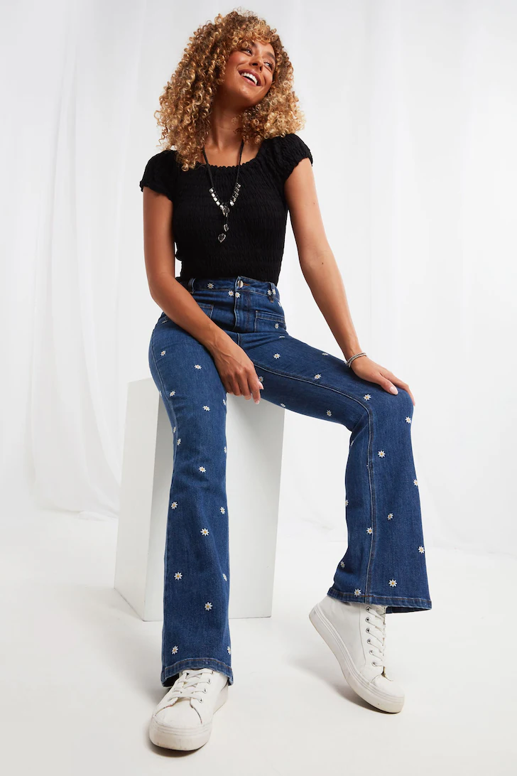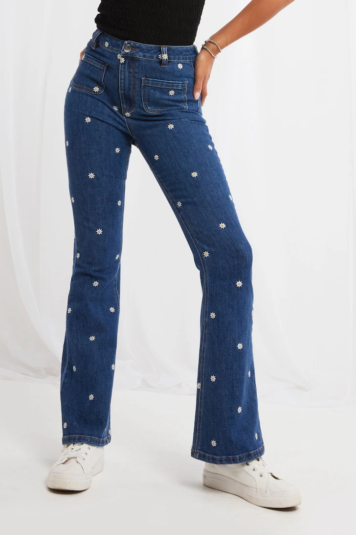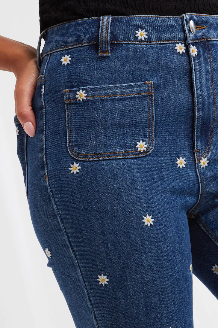 A cute twist on classic denim, it’s all in the detail with these stunning bootcut jeans. Popping with pretty daisy embroidery and finished with remarkable front pockets, we’ve created a truly unique style here. We even crafted its mid-wash denim from recycled polyester, so they not only look good, but they do good for the planet too. Approx Length: 31″.