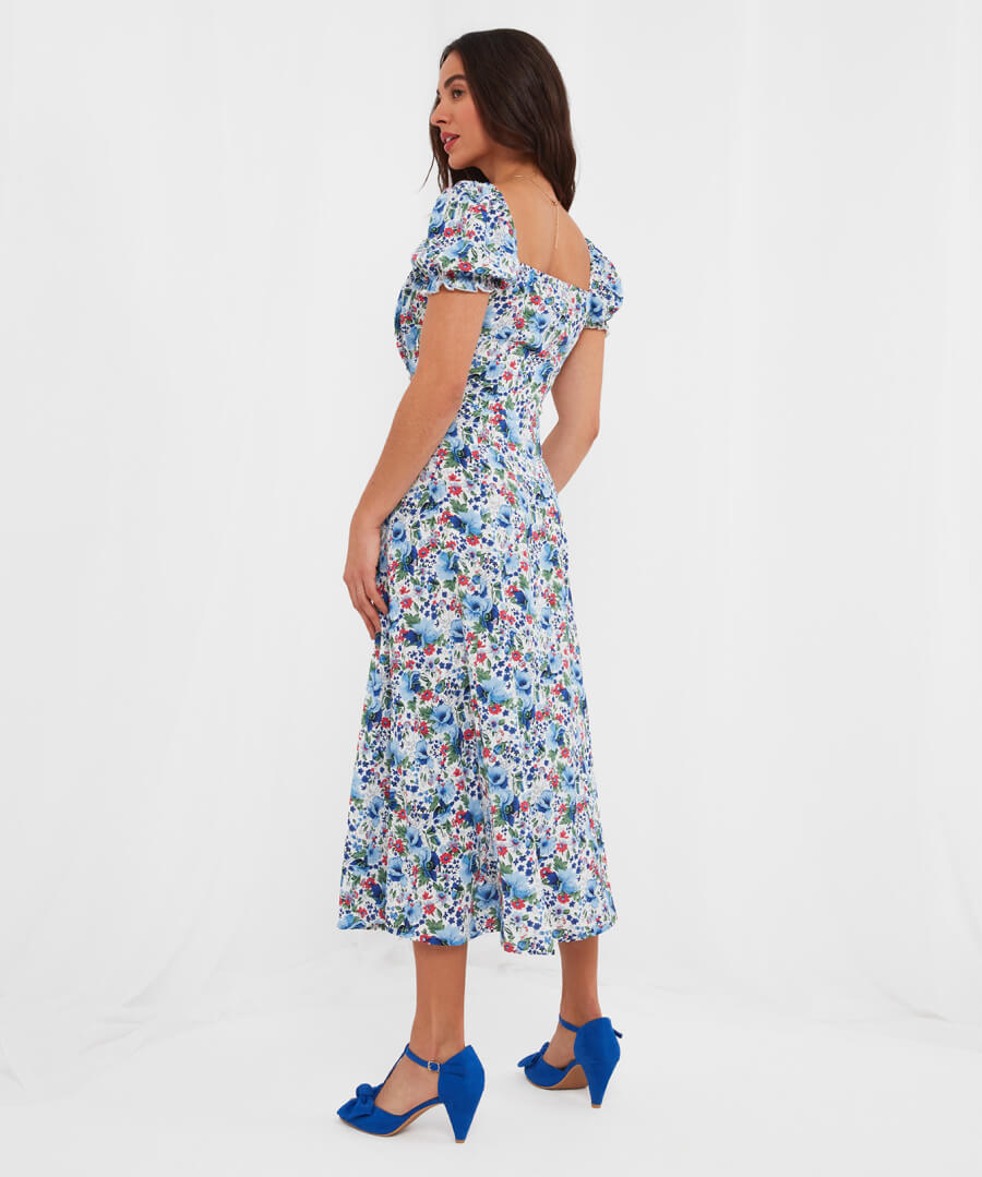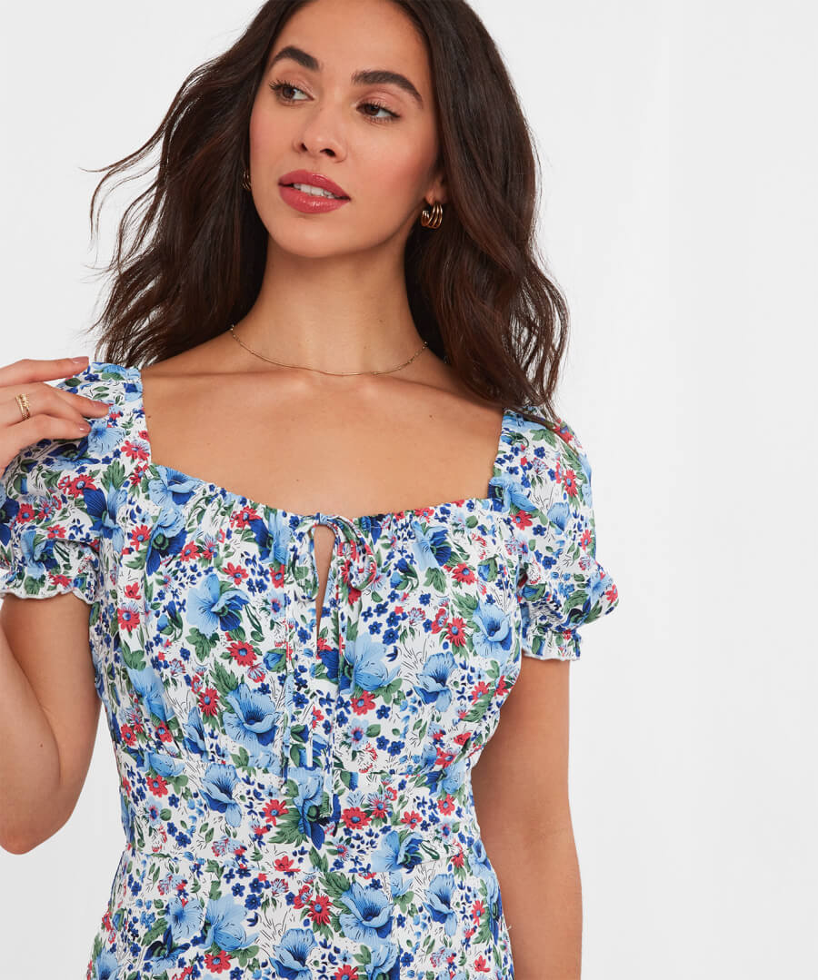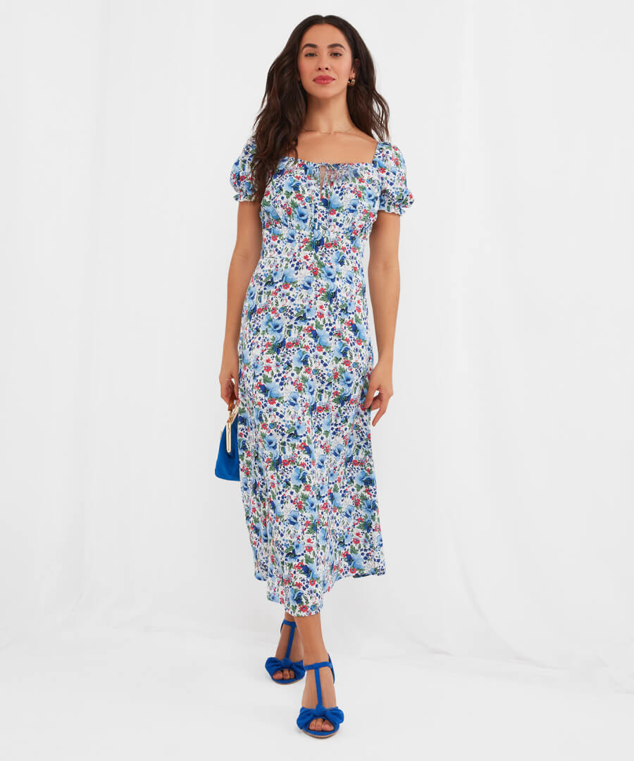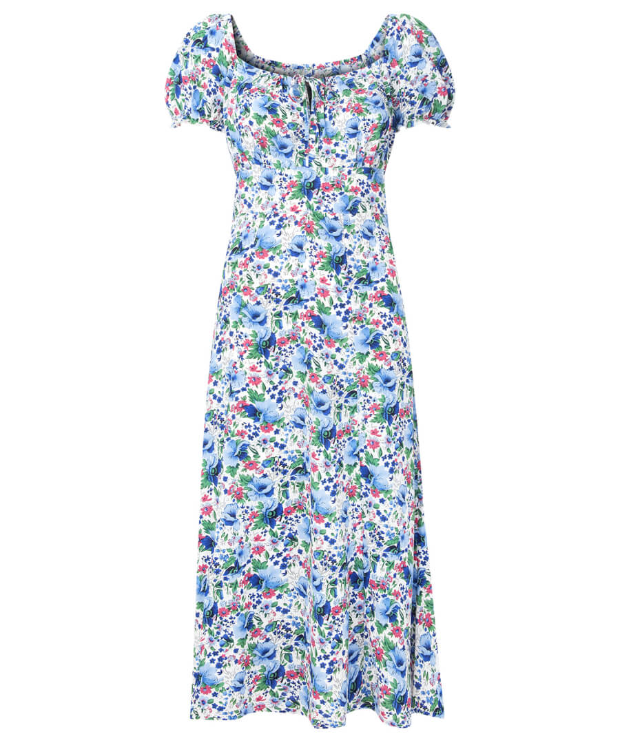 A midi dress for any occasion, it’s fabulously floaty and flattering. It’s the square neckline and tie at the bust that’ll help it sit perfectly, while the beautiful print makes it perfect for the season. Wear this midi dress on the shoulder for a luxe everyday look, or off the shoulder for summer weddings or a day at the races.
