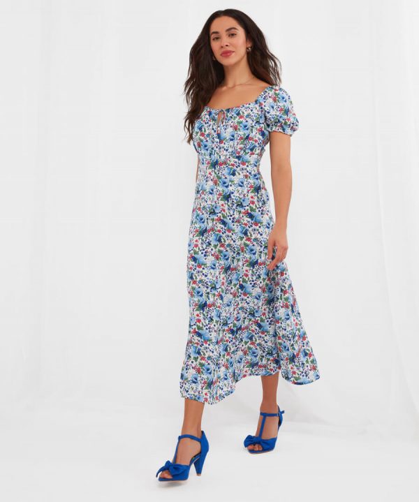 A midi dress for any occasion, it’s fabulously floaty and flattering. It’s the square neckline and tie at the bust that’ll help it sit perfectly, while the beautiful print makes it perfect for the season. Wear this midi dress on the shoulder for a luxe everyday look, or off the shoulder for summer weddings or a day at the races.