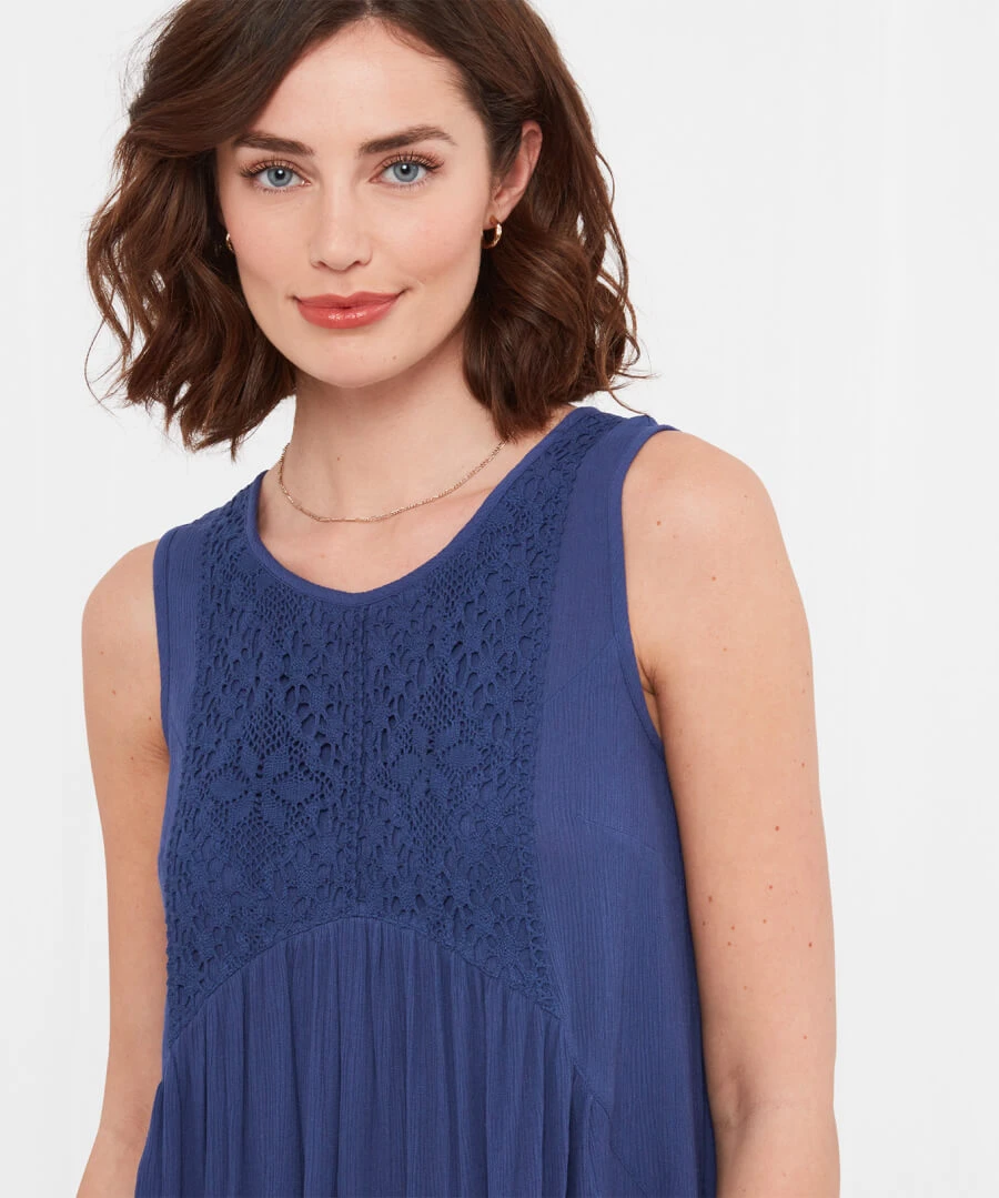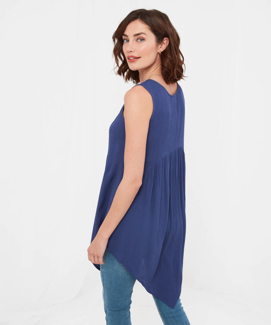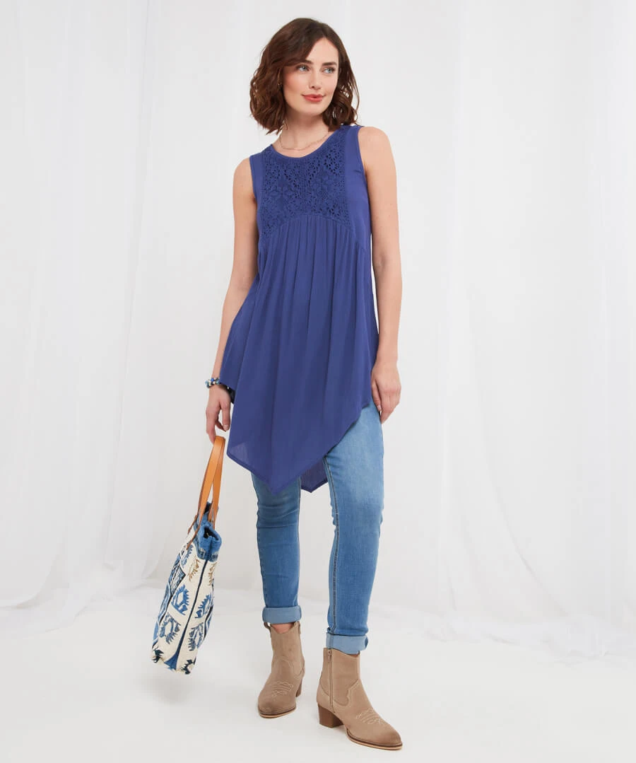This sleeveless tunic top is a wardrobe essential- there’s no doubt about it. For that Joe Browns twist, we edited a classic design by adding pretty lace to the chest panel and a V-shaped hem. Available in a stunning deep blue, perfect for this season, wear this classic tunic top your way for a unique, everyday summer style.