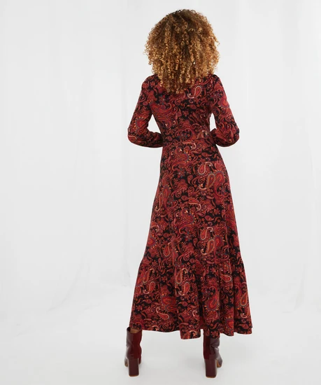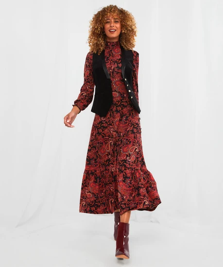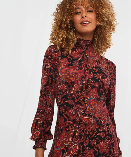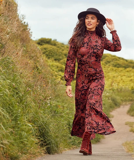 This vintage paisley dress brings a touch of boho style too for a totally unique look. We love the traditional feel of the stand up collar, V waistband and shirred sleeve cuffs – it works perfectly with the rich paisley print to create an exquisite addition to your autumnal wardrobe. Pair your long sleeve dress with your best accessories to wear it your way.