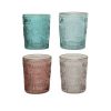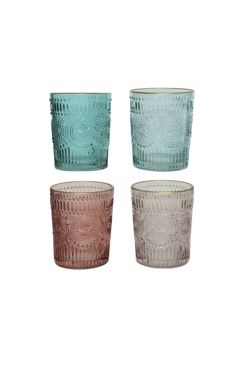 Tealightholder Glass Round Relief Gold Edge 4Col Ass