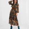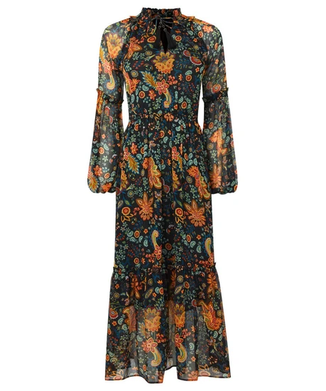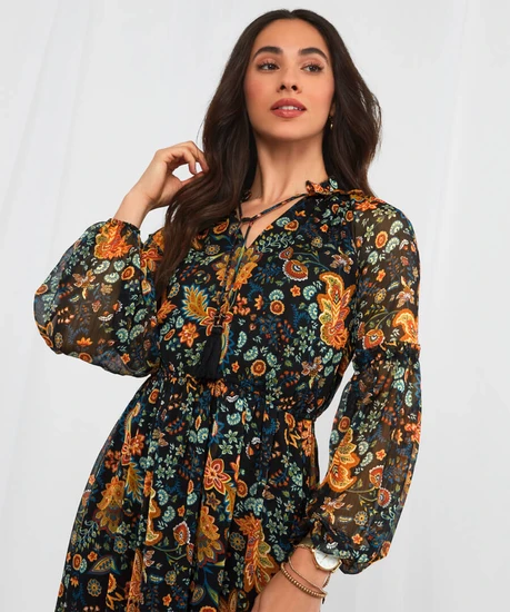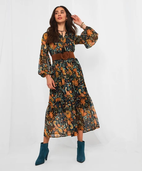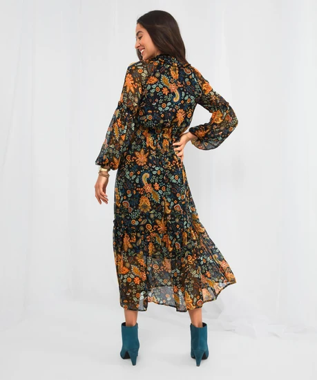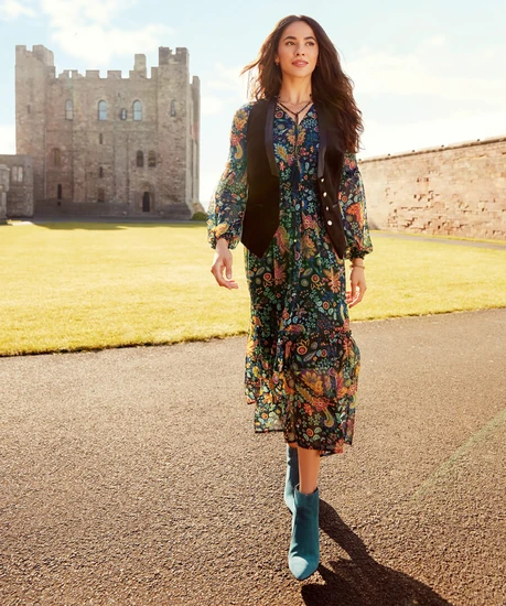 This floaty V-neck dress is ready and waiting for your autumnal adventures. Its frill trims and neck ties make it bold and beautiful, while the rich colours and long sheer sleeves mean it’s practical and perfect for the season. So, whether you’re on a weekend break or just going out to lunch, this dress will bring a stunning burst of character to your style.