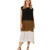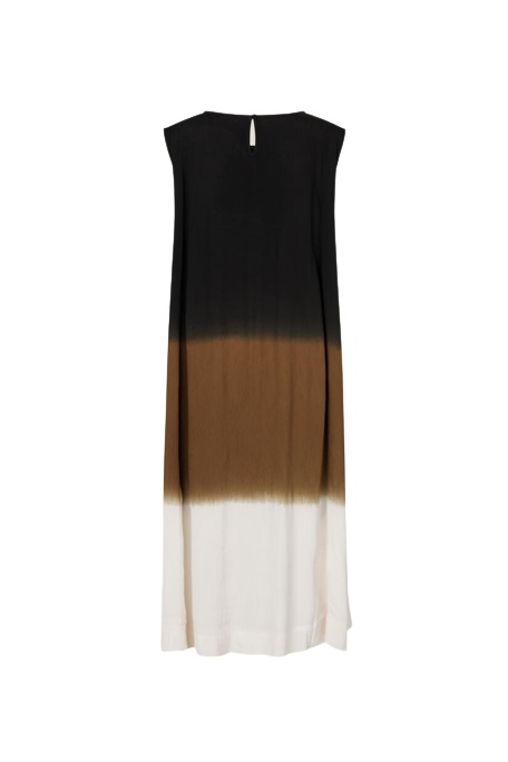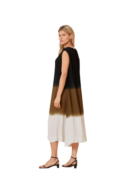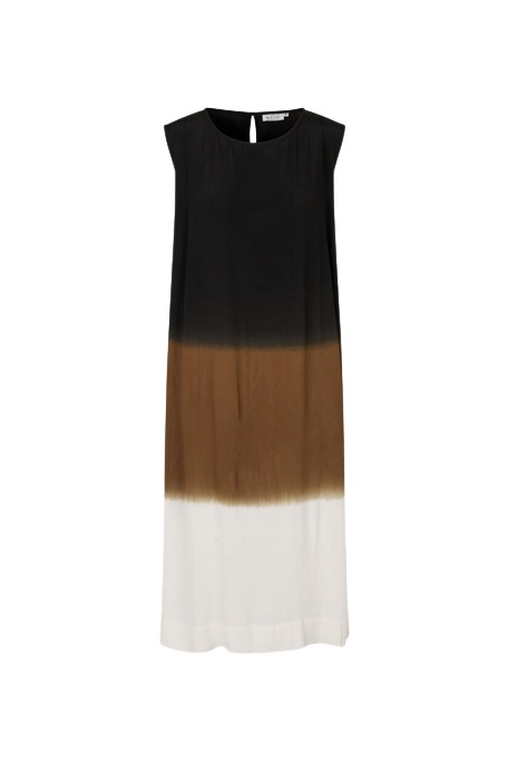 Contrasts make an outfit interesting, and this dress is full of them. The three blocks of color beautifully offset one another and give you effortless elegance. The soft viscose has a beautiful ribbed effect, and the loose and airy A-shape with extra fabric on the sides gives just the right amount of swing as you walk. The dress also has a small slit with a button fastening at the back of the neck. Wear the dress with our matching scarf for extra effect.
