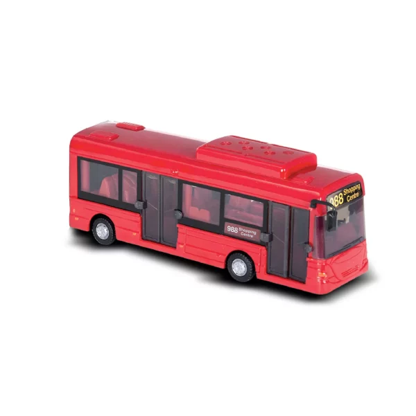 Free wheeling bus with opening doors and detailed interior, diecast metal and plastic parts, length 22cm, 3 colours assorted.
