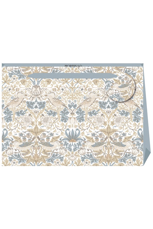 A premium designed Morris & Co ‘Vellum Strawberry Thief’ Shopper Style Bag threaded with a Taupe coloured grosgrain ribbon handle and a matching designed circular tag. Height 275mm x Width 365mm x Depth 120mm.