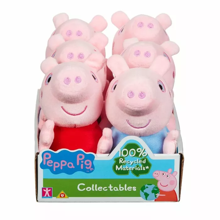 This is an assortment pack. 1 will be supplied and picked at random. Colours and decorations may vary. Peppa?s Eco range of soft cuddly toys are excellent quality and made with 100% recycled materials. Fashioned for young Peppa fans whilst staying true to the classic Peppa styling, these environmentally friendly toys aim to bring super soft fun to playtime. These cute and cuddly soft toys measure 6? tall and are perfect to take with you where you go. Choose from Peppa or George.