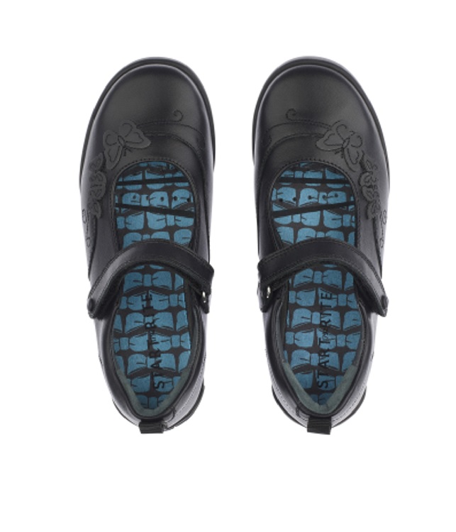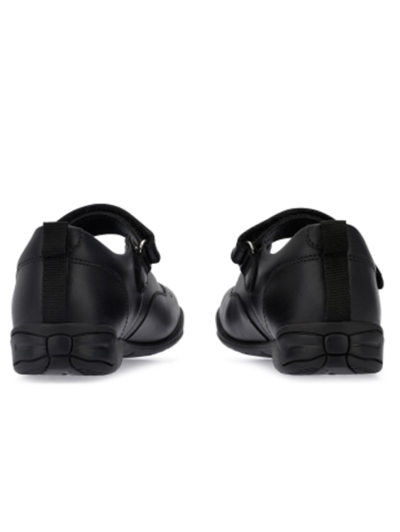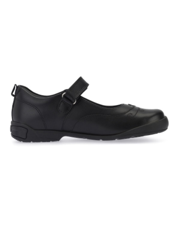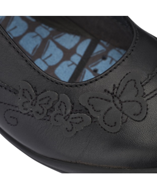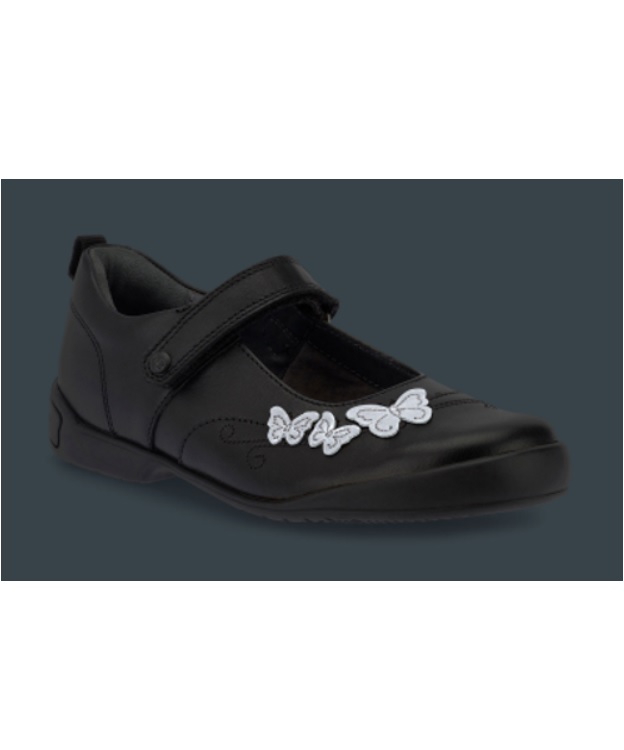 A stylish yet scuff-resistant black leather girls’ pump for schoolwear with superior comfort features. Targeted flexibility and cushioned footbeds offer premium comfort with reflective butterfly detailing for night-time visibility. A school shoe pump with staying power with a durable sole and toe bumper to help protect against scuffing. Riptape fastening for easy on/off.