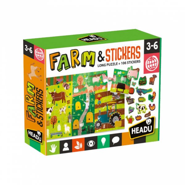 A large puzzle of the farm to be completed with more than 100 stickers to paste and re-stick. Assemble the pieces then observe the silhouettes of the subjects, find the corresponding stickers and stick them in the right place!