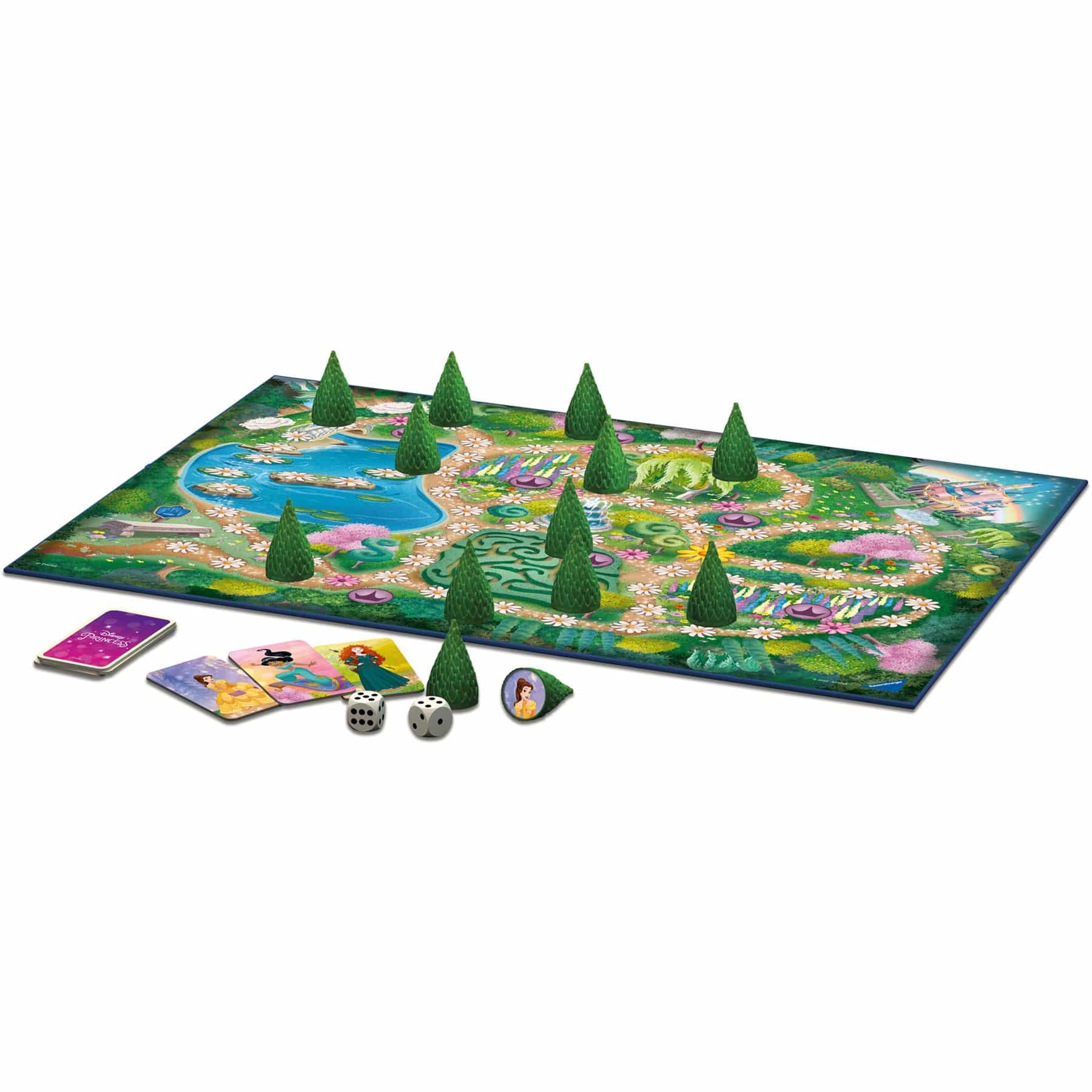 It’s a fun play experience – roll the dice and race around the enchanted landscape. Search under the decorative sculpts and then race to the finish space when you’ve found them and win their cards. Each time a treasure is found, a new card is revealed, until all the Disney Princesses have been found. The player who finds the most friends, is the winner.