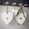 Set of 3 hearts with small cut out stars int he centre. Hangs form Brown twine. Measures 25x25cm, 20x20cm, 15x15cm.