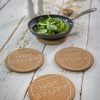 8mm thick cork coasters in a set of 4 tied with twine. Printed with white lettering “Hot Stuff” Meausres 18cm diametre. Care instructions : -Wipe with a damp cloth and dry thoroughly with a soft cloth.