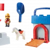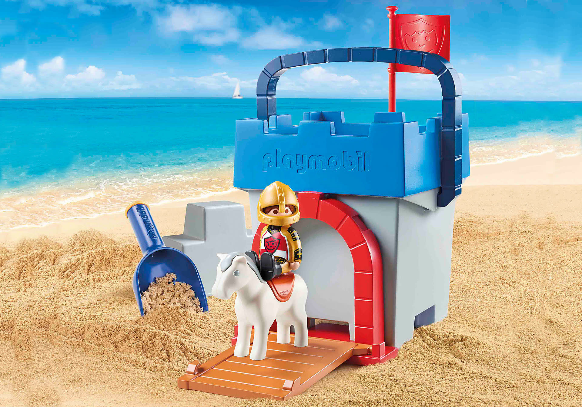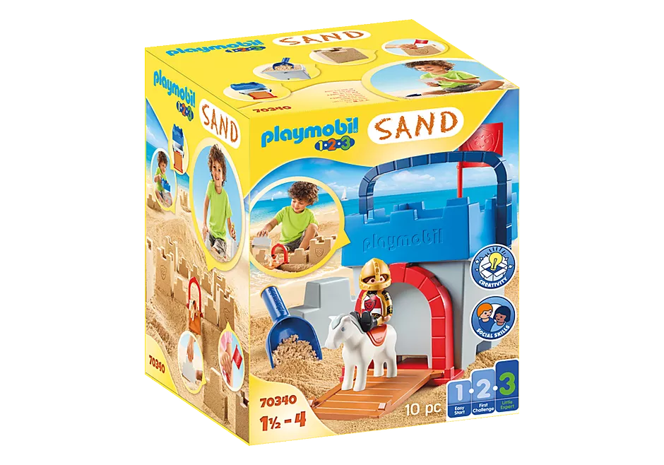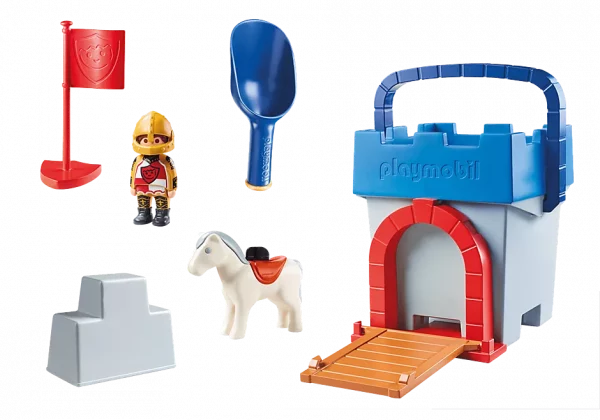 With the creative set Sandburg” young people can Master builders design their own huge castle complex: including moat, drawbridge and knight’s coat of arms. Creative set consisting of bucket, sieve, shovel, sand moulds “”castle wall””, castle gate with drawbridge and sand stamp “”knight’s coat of arms””. With PLAYMOBIL 1.2.3 figures knight and horse. Capacity bucket approx. 1600 ml. Dimensions bucket with handle: 17 x 16 x 22 cm (LxTxH).”