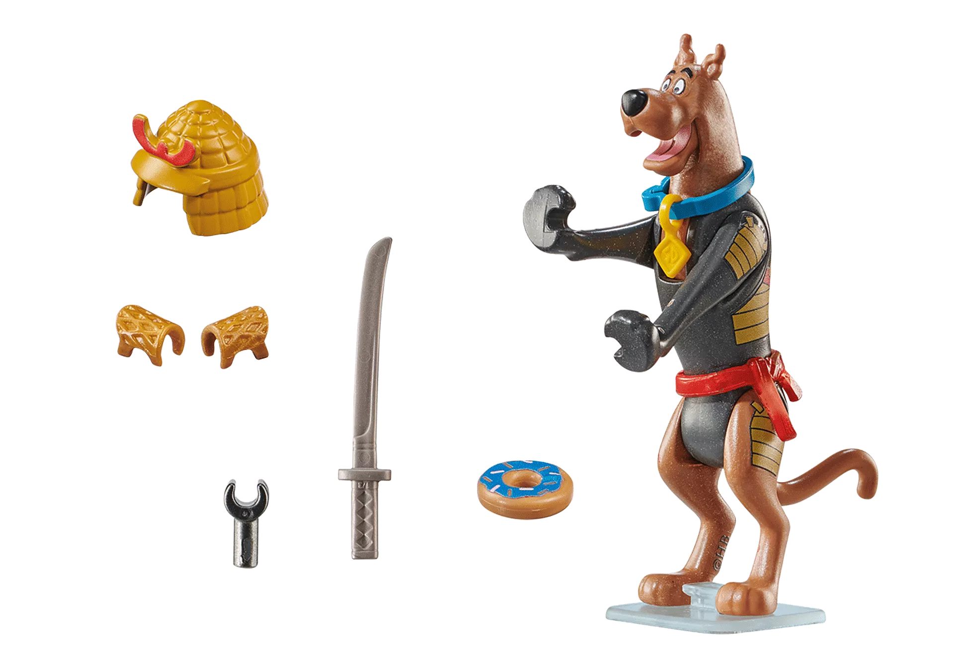 Training has begun for SCOOBY-DOO! Collectible Samurai Figure! Scooby-Doo™ is learning the skills and discipline necessary to be a sword fighter. Set includes Scooby-Doo, head gear, and sword! Recommended for ages five to twelve years. Warning. Choking Hazard. Small parts. Not for children under 3 years.