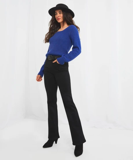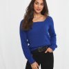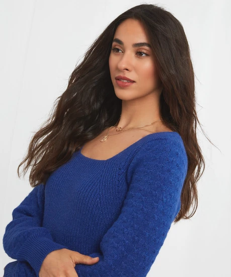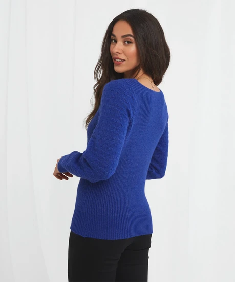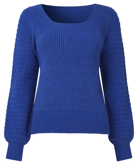 Stay warm this winter in our cute square neck jumper in the coolest shade of blue. Combining two different knit patterns, this jumper will flatter any figure beautifully thanks to its balloon sleeves and ribbed cuffs. Simple yet elegant, our cosy knit jumper will add a touch of sophistication to any layered look this winter.