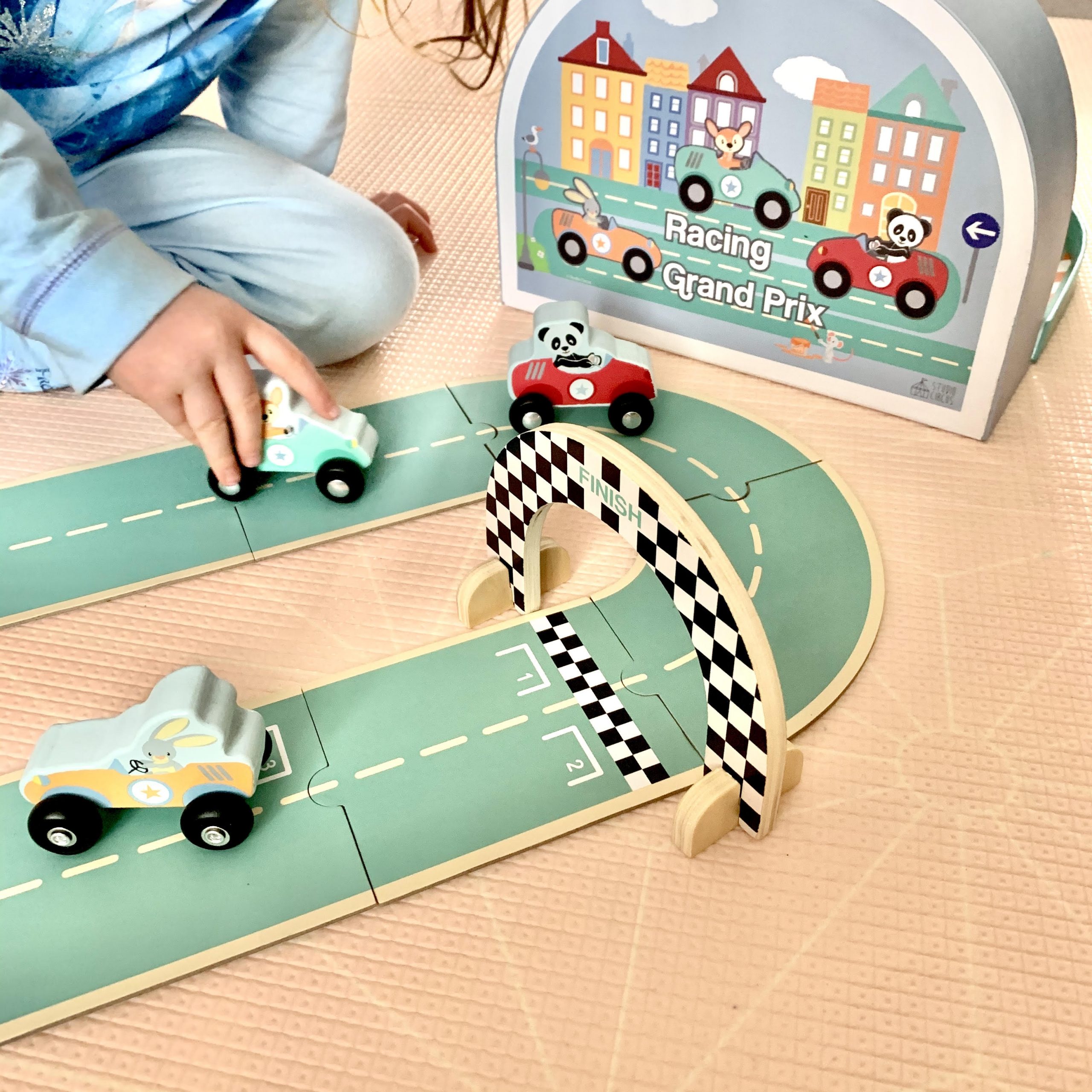 Children will be delighted with this foldaway Grand Prix race track and racers. The track pieces and cars pack away in to the portable travel case, Perfect to take on their adventures.