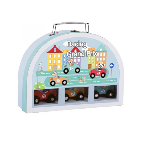 Children will be delighted with this foldaway Grand Prix race track and racers. The track pieces and cars pack away in to the portable travel case, Perfect to take on their adventures.