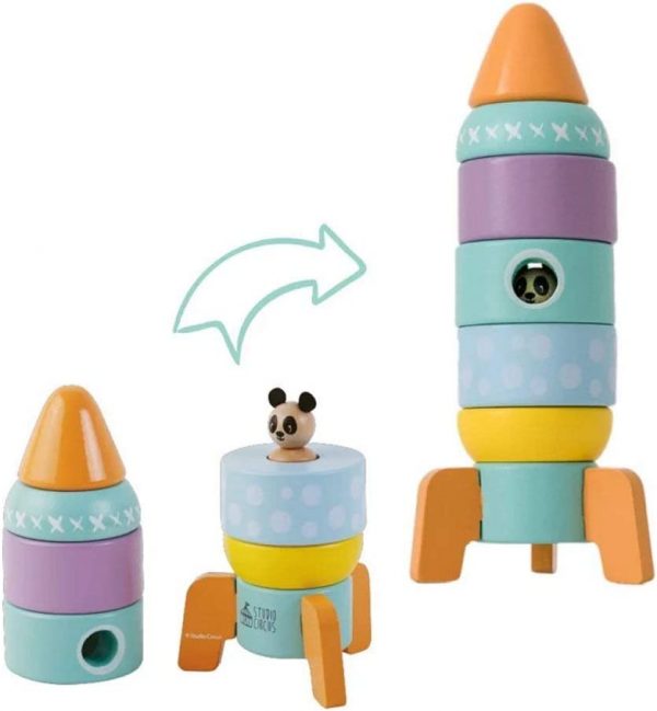 Introducing this absolutely adorable new Studio Circus Peekabo Tower- Featuring the lovely Panda that we all love as the pilot of his rocket! The rocket is made of quality wood and comes apart in blocks which is perfect to teach hand eye coordination and the perfect sized pieces for little ones to grab hold of and if they want to (which we all know too well that they will)- have a little nibble! Finished in the classic Studio Circus colours that you simply can’t miss or go without.