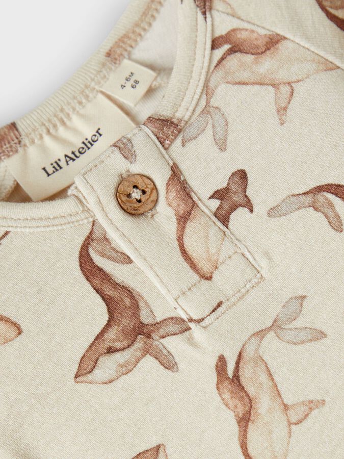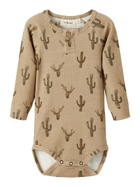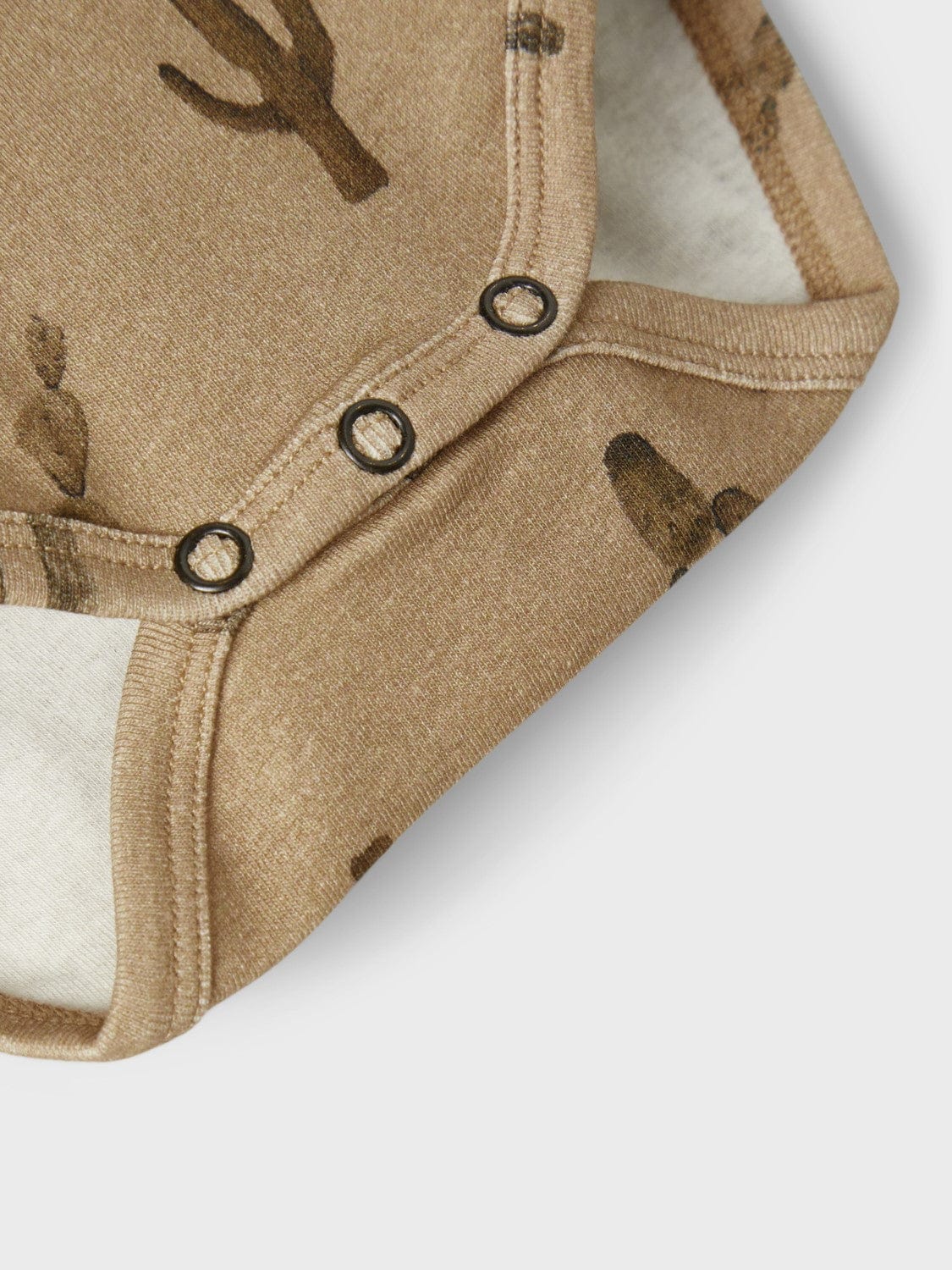 Lil’ Atelier NBMGEO bodystocking in a nice light brown shade and with cacti. The body is with a nice wooden button at the front. Closes with press studs between the legs. Made in a soft and stretchy material.