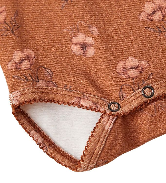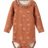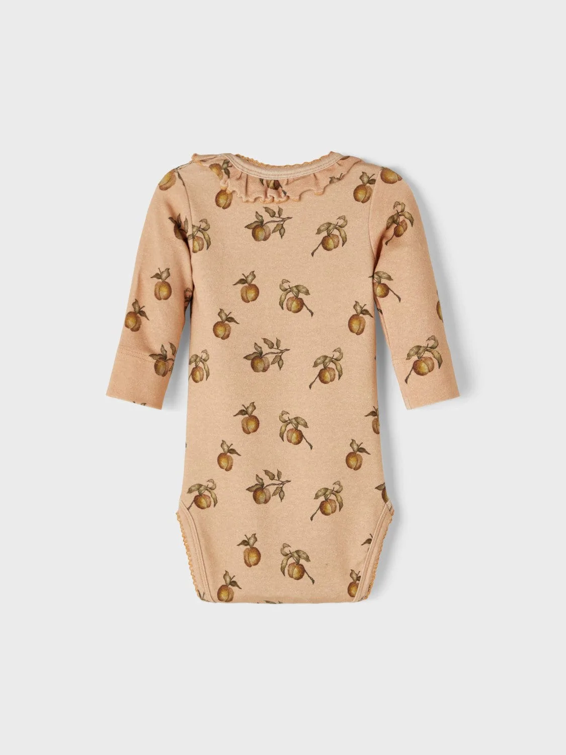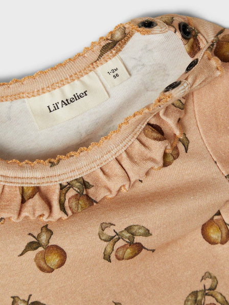 Lil’ Atelier NBFGAYA bodystocking in a nice light shade with peach print. The body has a cute frill collar and closes with press studs on the left shoulder and between the legs. The body is super soft and stretchable.