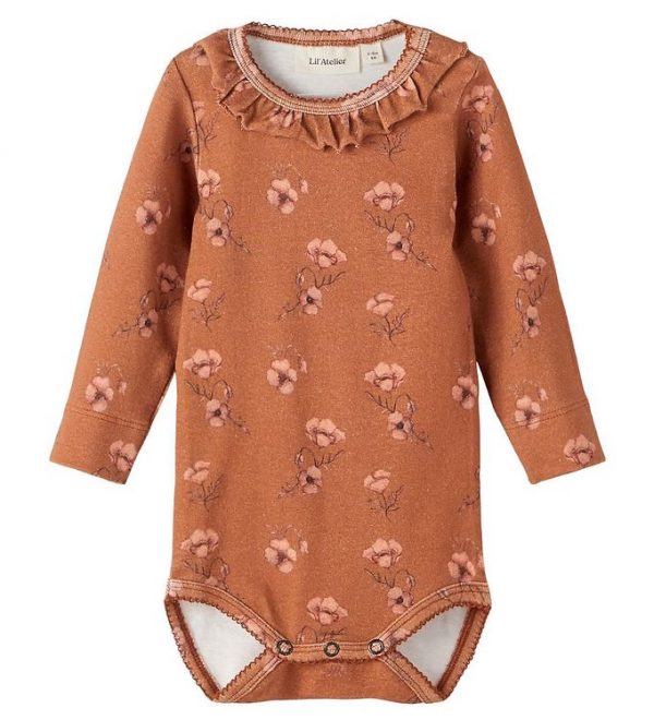 Lil’ Atelier NBFGAYA bodystocking in a nice light shade with peach print. The body has a cute frill collar and closes with press studs on the left shoulder and between the legs. The body is super soft and stretchable.