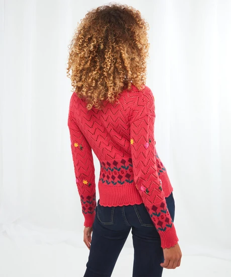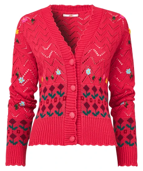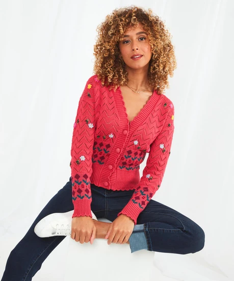 Warm and cosy, this cosy women’s cardigan is just the thing for those chilly afternoons. Its vibrant design and floral embroidery suits the season to a tee, while covered buttons and scalloped edges add the perfect finishing touches. Our ladies cardigan is in a style that truly stands out from the crowd, you’ll feel so pretty in pink.