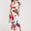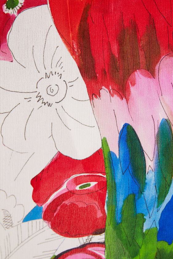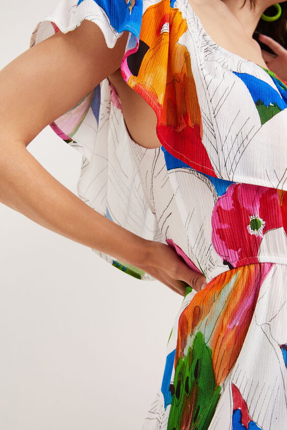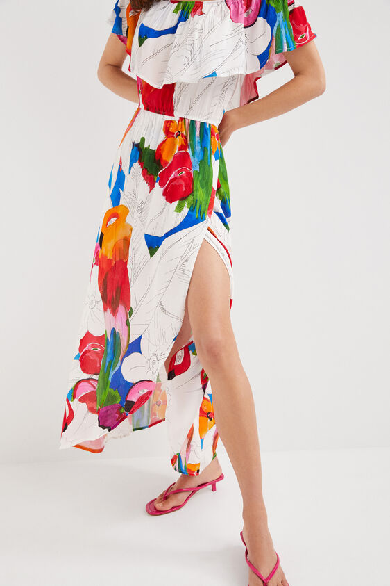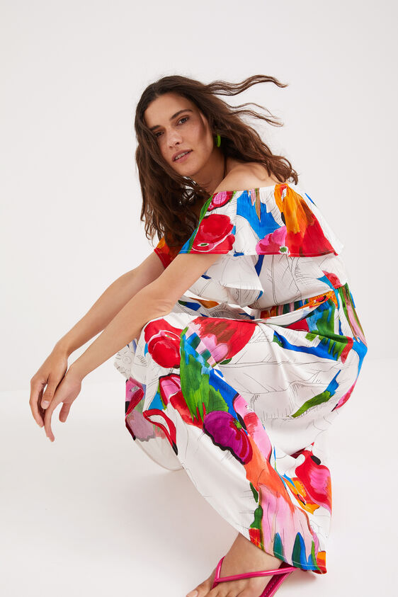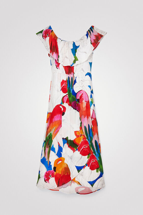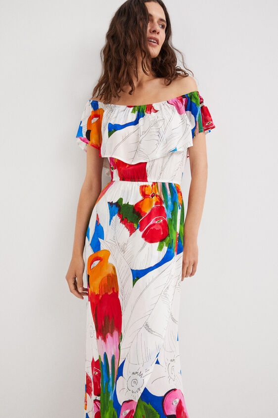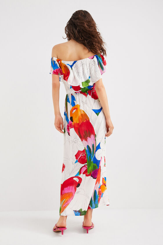 Very light fabric with lots of texture. A boho dress with a flounced neckline, a long sarong-style skirt, and a flower and parrot tropical print.