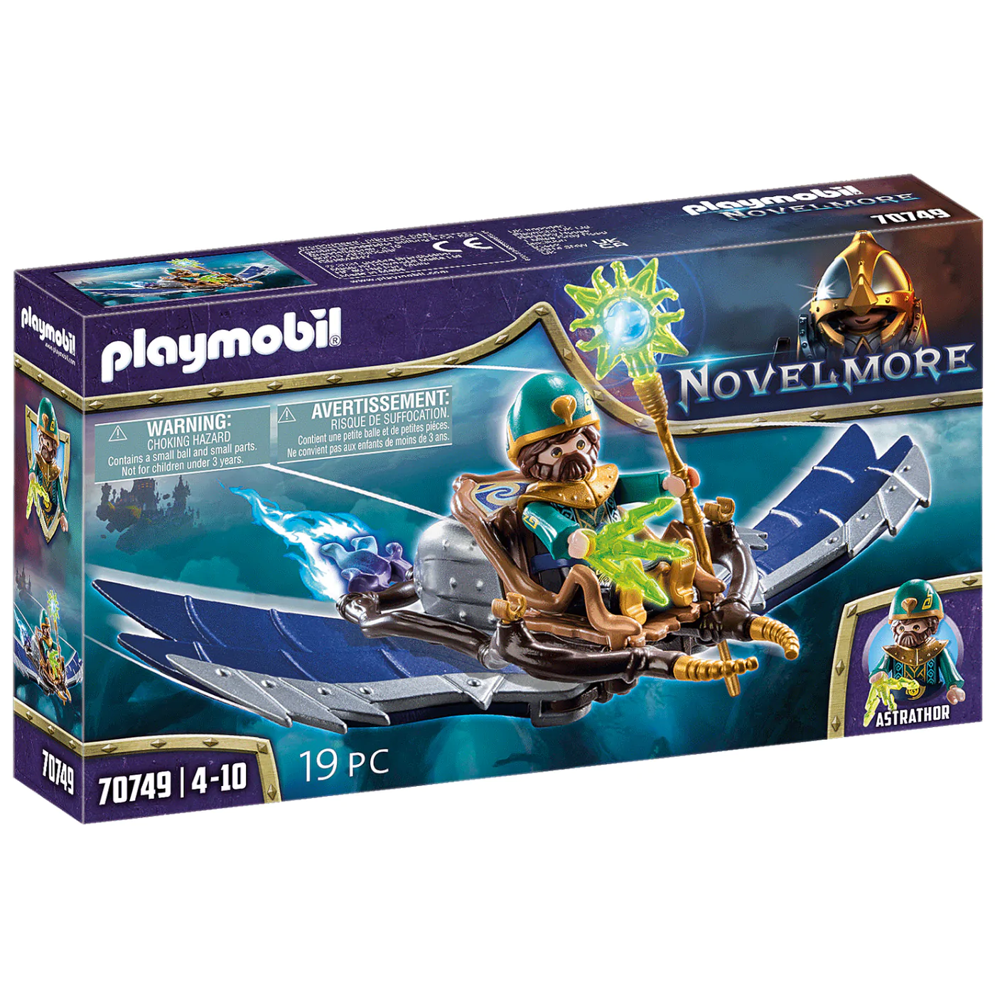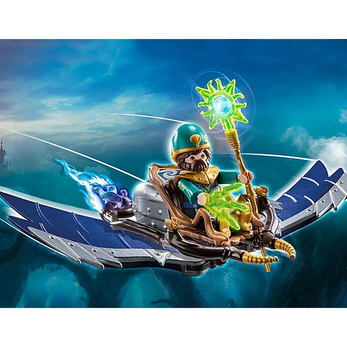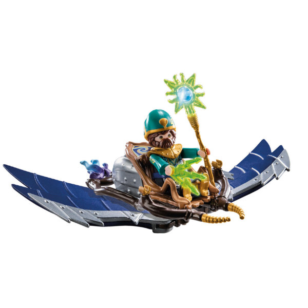 Cunning Astrathor is the magician of the air. With his wind glider, he floats across the sky as if by magic and watches out for evil forces. His magic even enables Astrathor to influence the weather. If he spots a demon, he waves his magic wand, casts a spell and in an instant a violent storm comes up. The evil spirit is quickly put to flight. The playset includes Novelmore character wizard Astrathor with magic wand and a wind glider with wings to unfold.